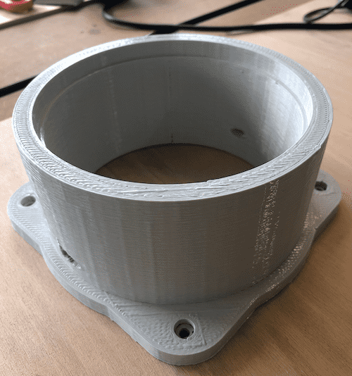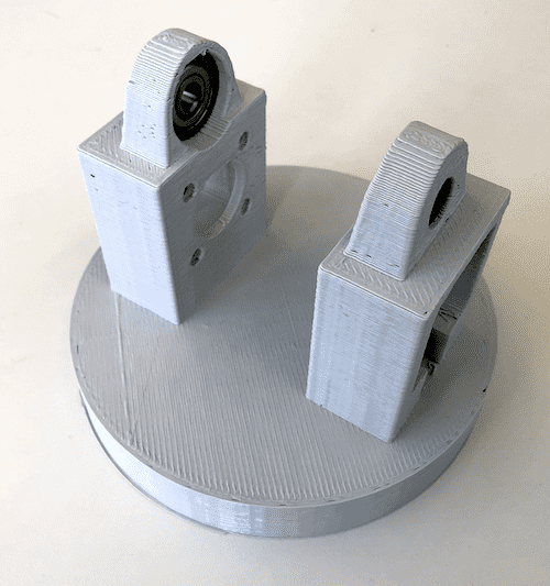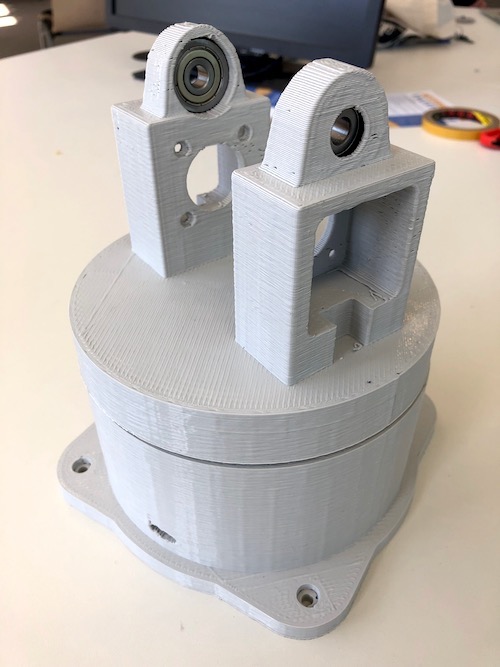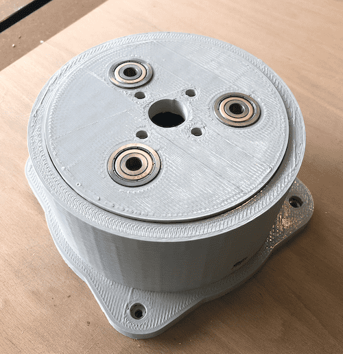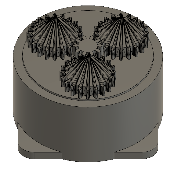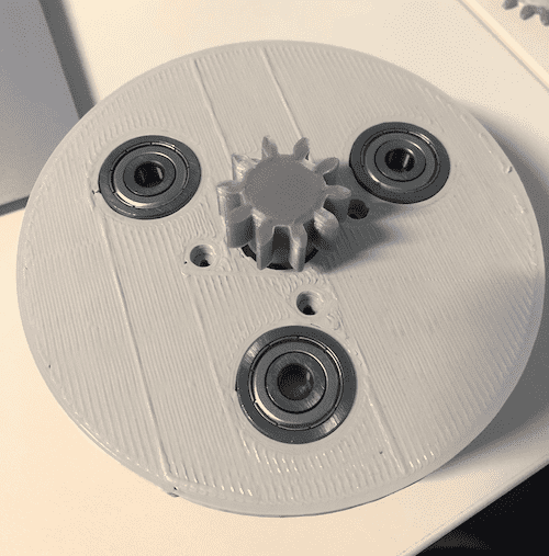 The goal was to let the arm pick up something and move it to somewhere else. I decided to design the bottom part and as well some gears. I found this beautiful planetery gearset on Thingiverse and modified it to my needs. This gearset is able to to distribute the weight among several gears. To create the design I used Autodesk Fusion 360. To get a full introduction on how to use Fusion 360 got to the Computer-Aided Design assignment. Below you can see the finished design of the bottom part. Three placeholders for three ball bearings were taken into account in the design. In this way, the weight is not transferred to the supporting gears but to the ball bearings, which can withstand much more pressure. In addition, this technology prevented the stepper from carrying the entire weight.