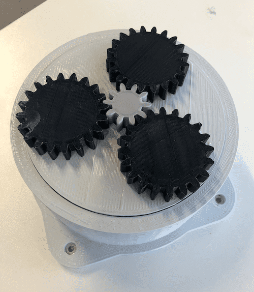 In this case, the planet wheels and the planet carrier are the ones that are kept stationary, while the ring gear is the one that moves. Planetary gears are often used when space and weight are an issue, but a large amount of speed reduction and torque are needed. For this reason I decided to use planetary gears, because the bottom part has to carry the whole weight of the arm.