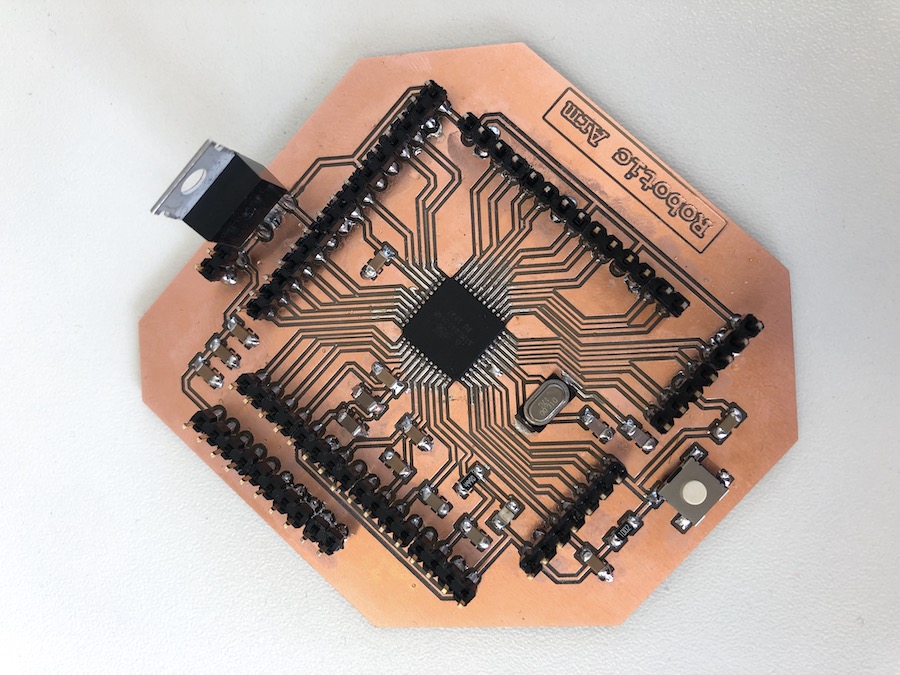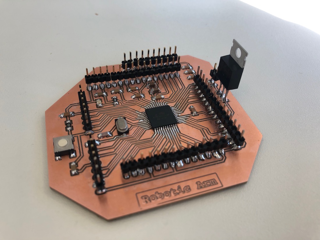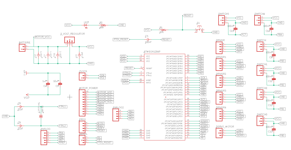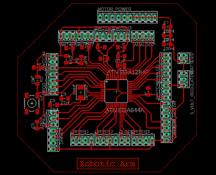 I also created the microcontroller board for this week's assignment. I decided to use a Atmega1284, since it has more pins and we are going to use 5 stepper motors and one servo motor. To get a full introduction on how to make a Schematic and Board Layout with Eagle go to the Electronics Design week.
