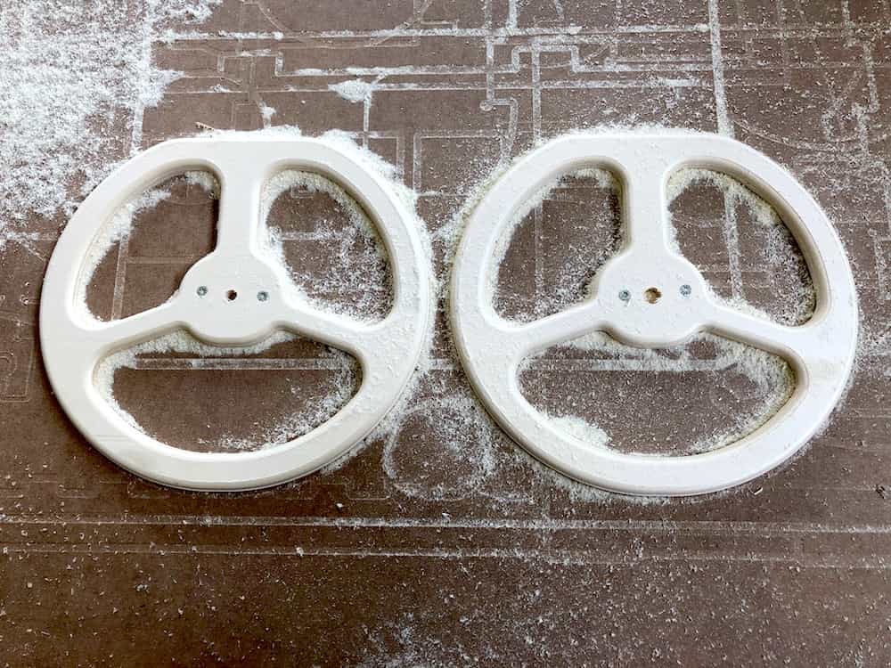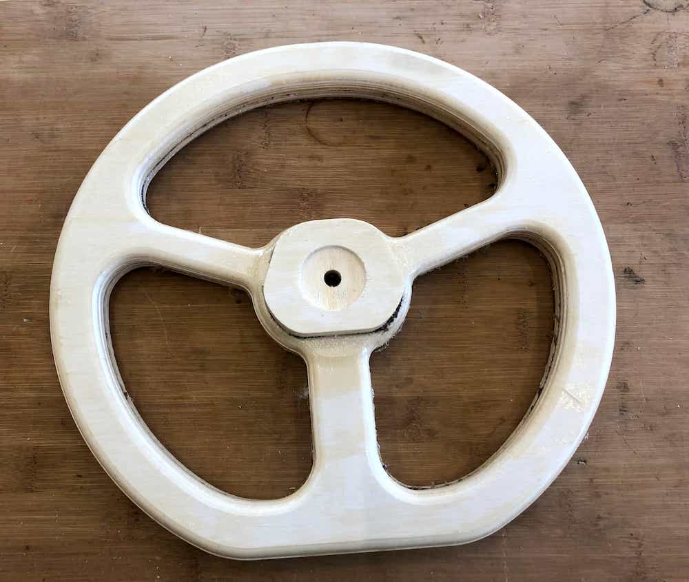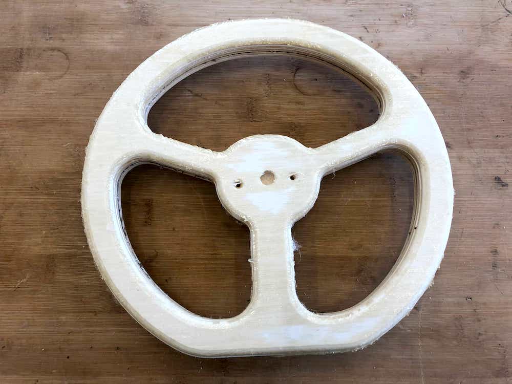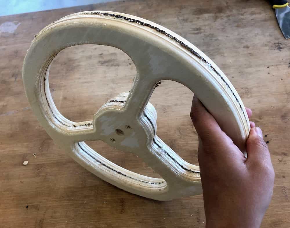 The next morning it was completely cured. The steering wheel can now withstand a lot of pressure without breaking. That was exactly the goal, since the steering wheel is the only thing you hold on to when you have an accident. It's extremely robust when compared to what it's made of (extremely light poplar plywood and jute).