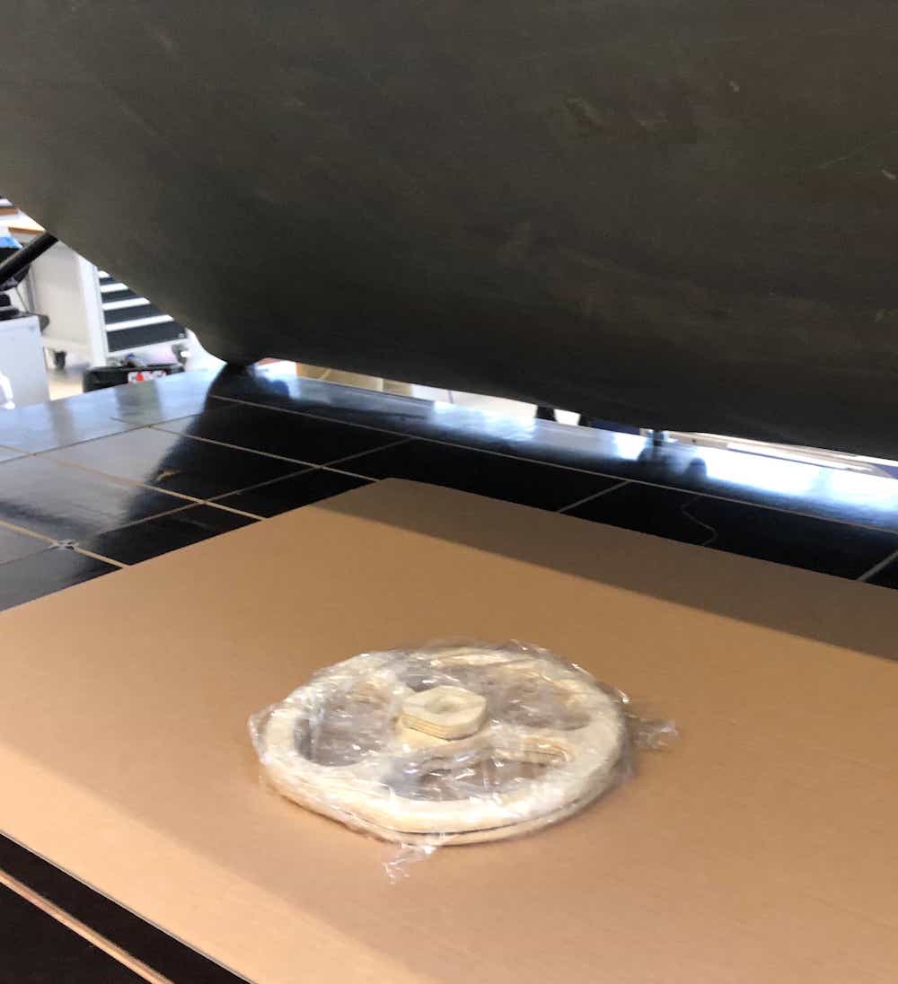 I used a sheet of cardboard as underlay to prevent that some of the epoxy resin gets on the bed of the vacuum machine. I left the composite over night under vakuum.