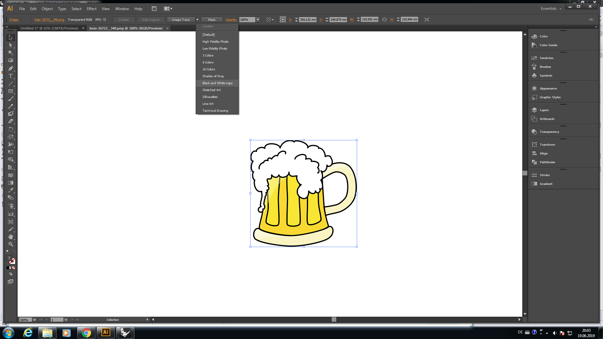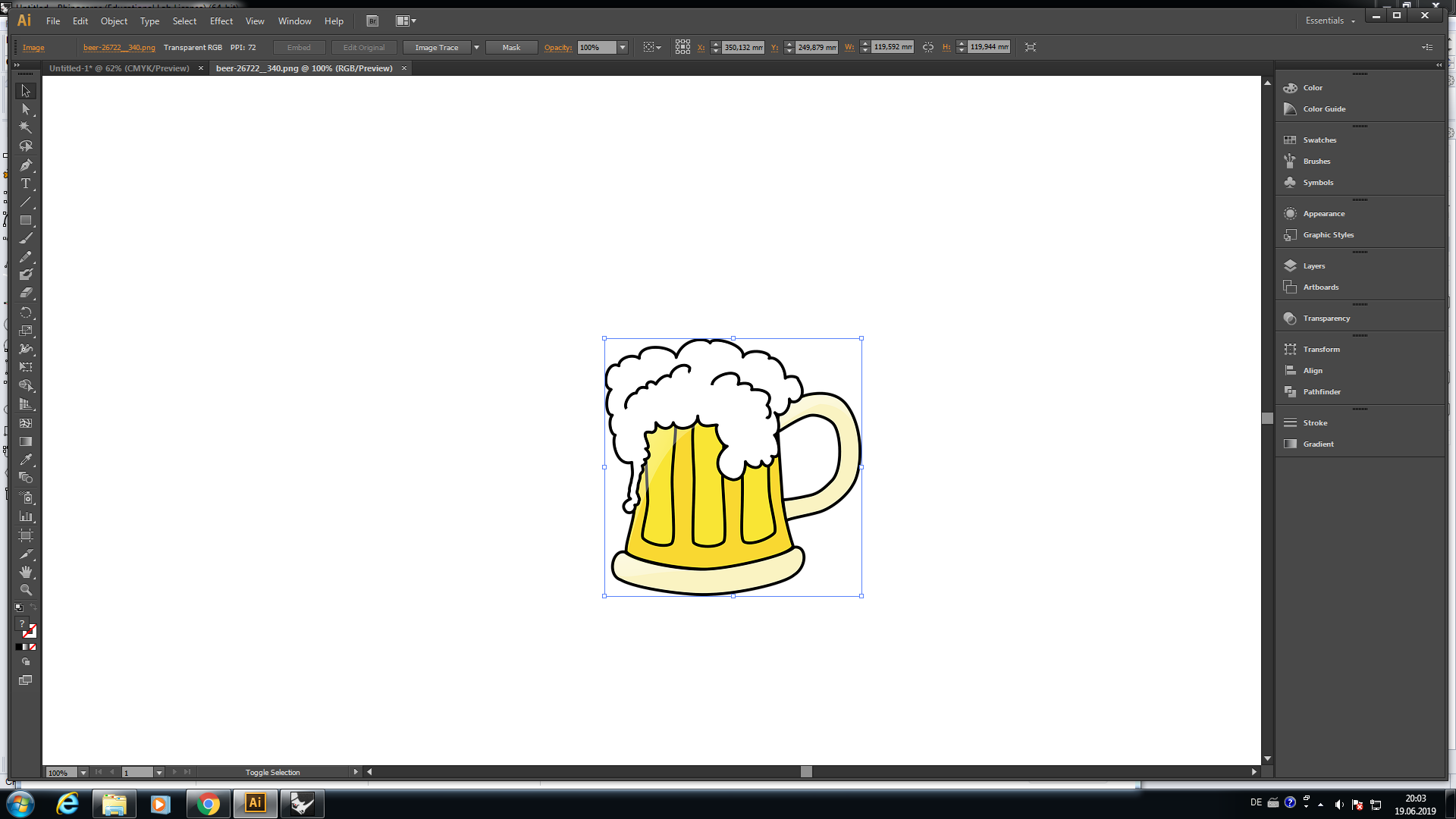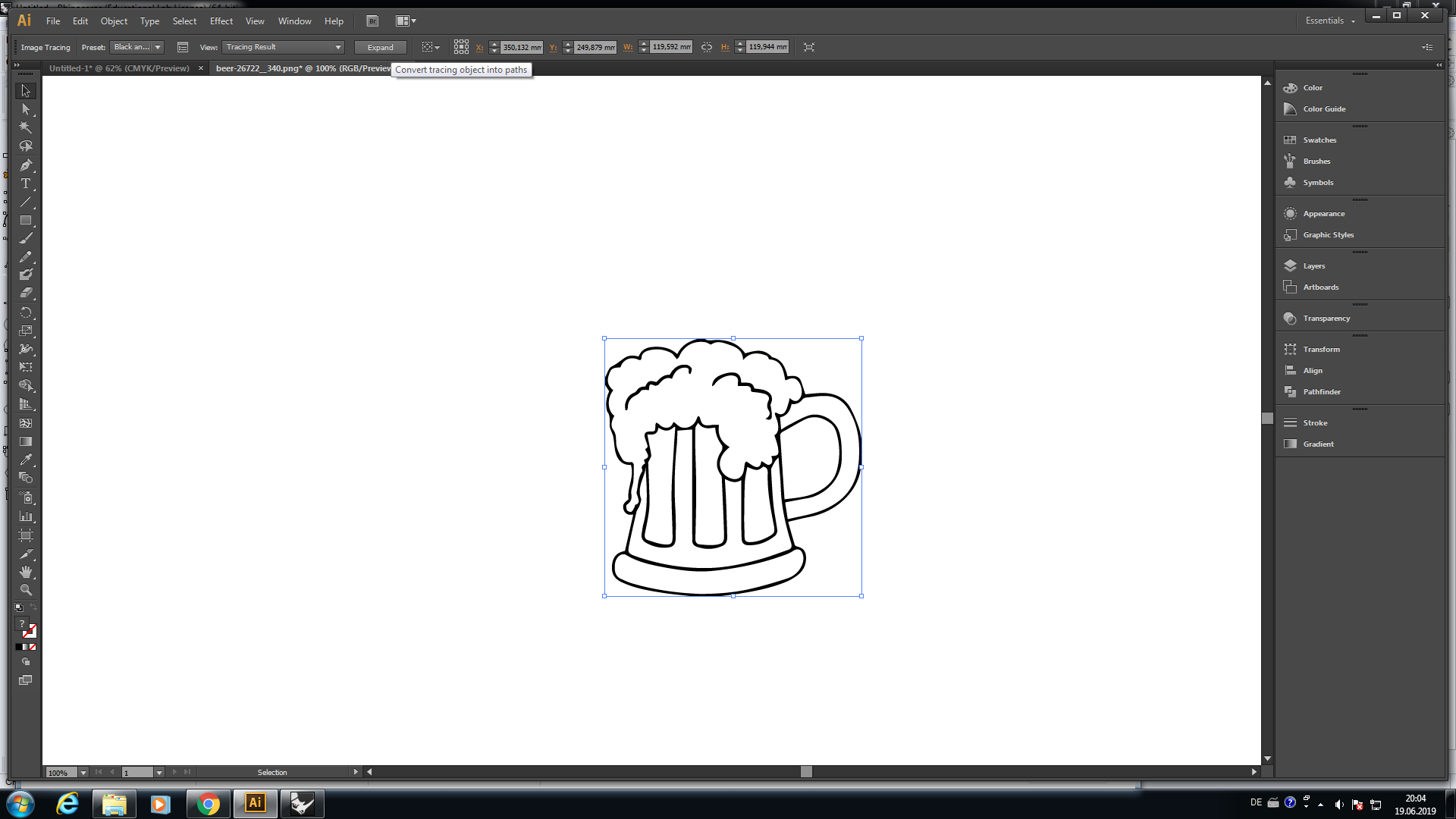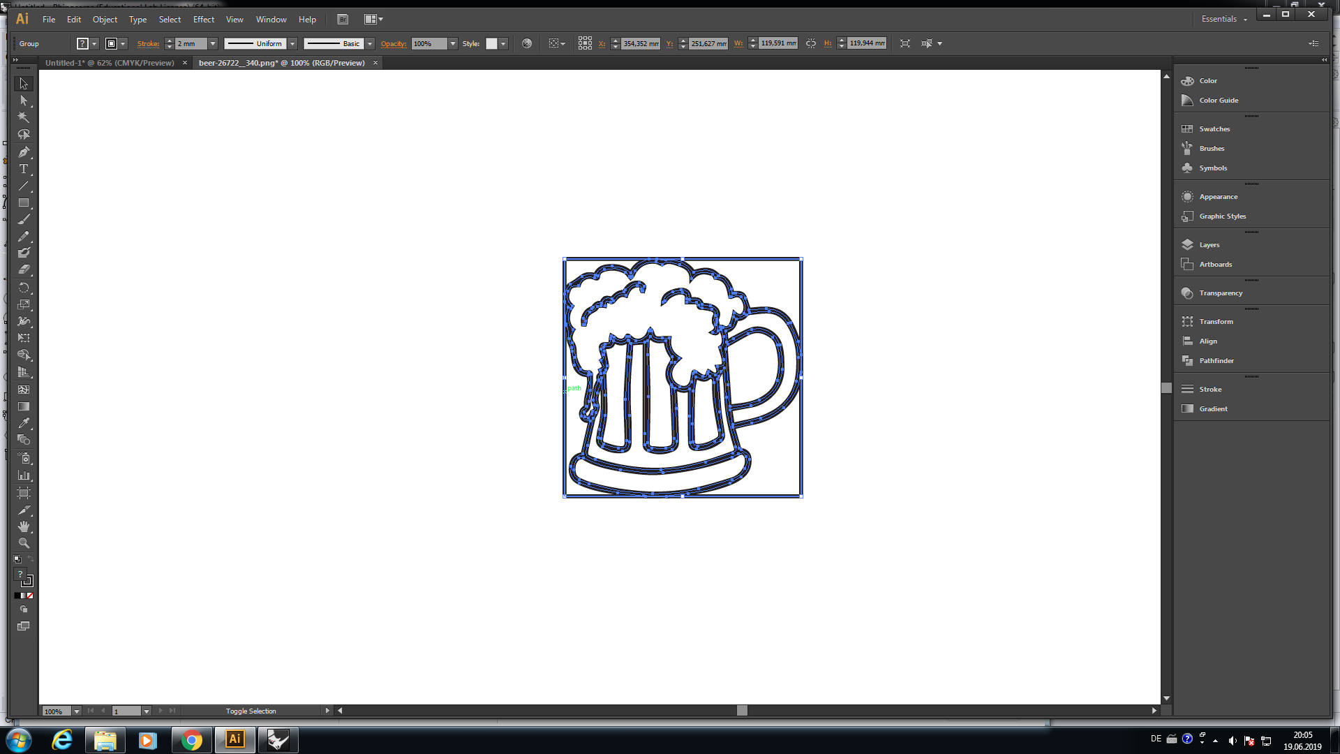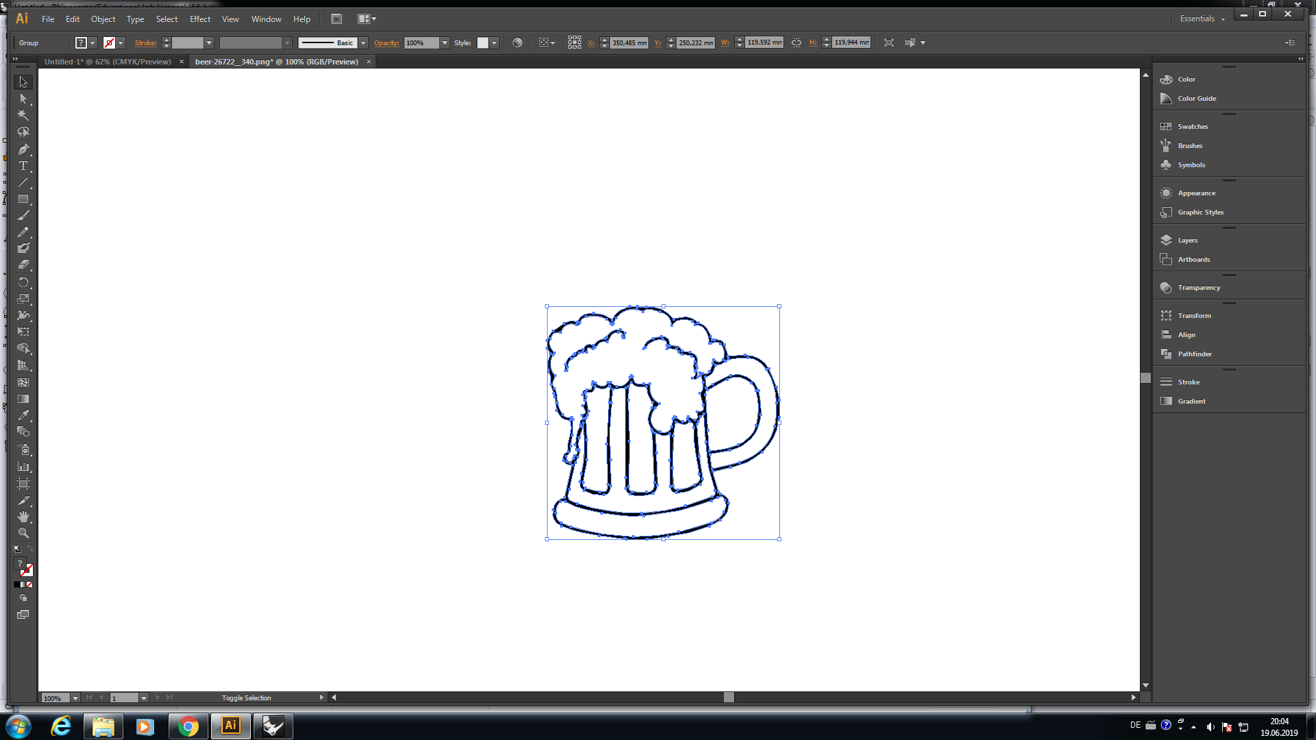 Adobe Illustrator is a software application for creating drawings, illustrations, and artwork using a Windows or MacOS computer. It is used to create a variety of digital and printed images. I often use it to create a design for the vinyl cutter. For instance below I wanted cut out a beer mug with the vinyl cutter.
