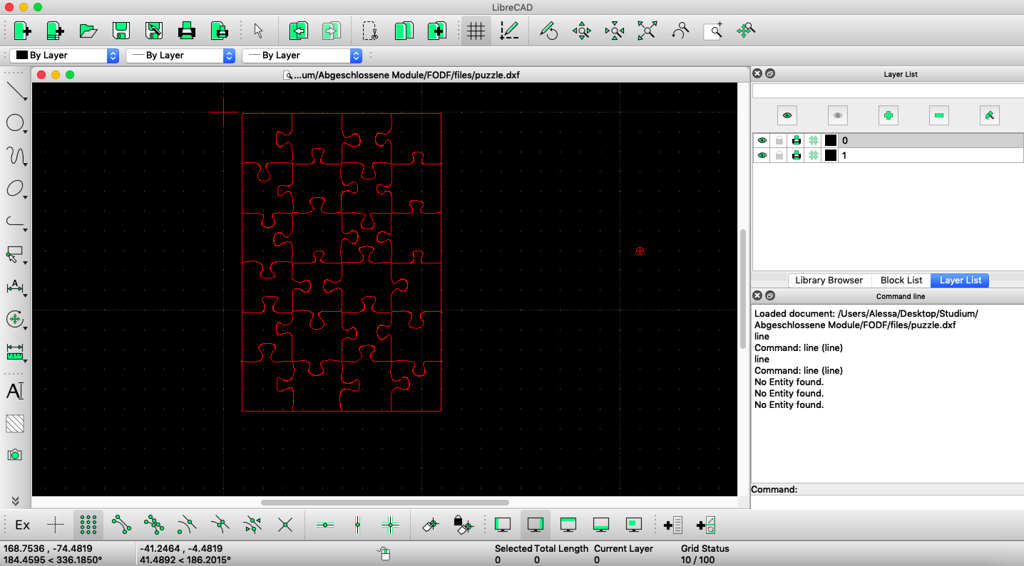 I used LibreCAD to design a photo puzzle using the spline and line tool. It was a nice experience to try a different kind of software, but it would have been easier for me to develop it in Fusion 360.