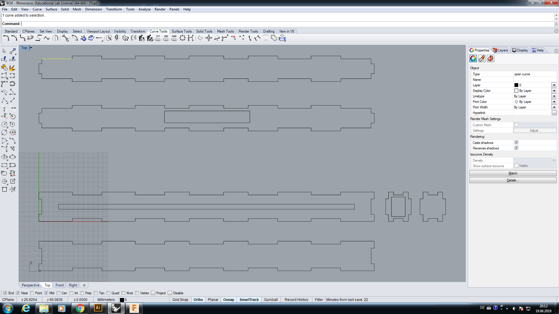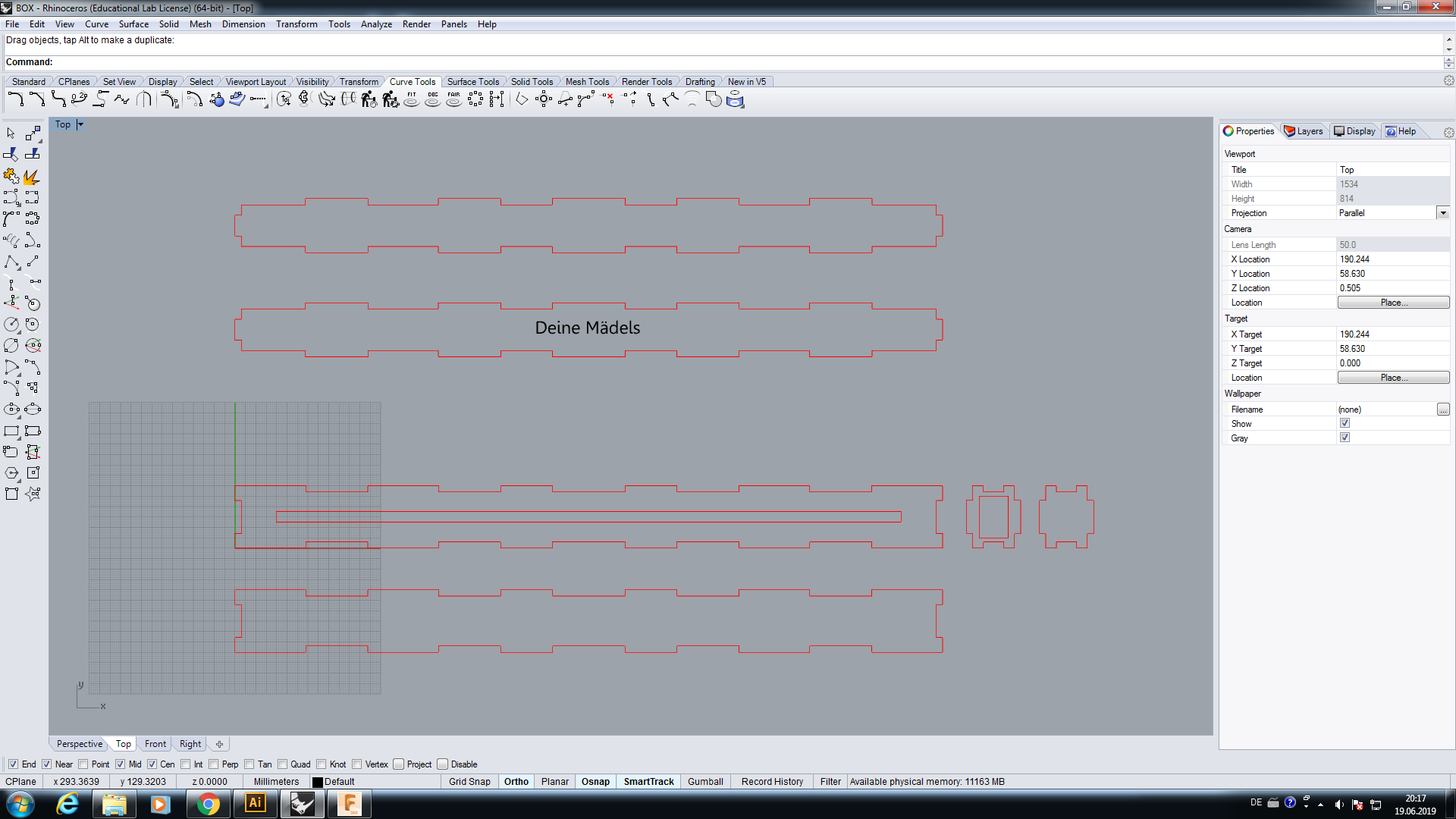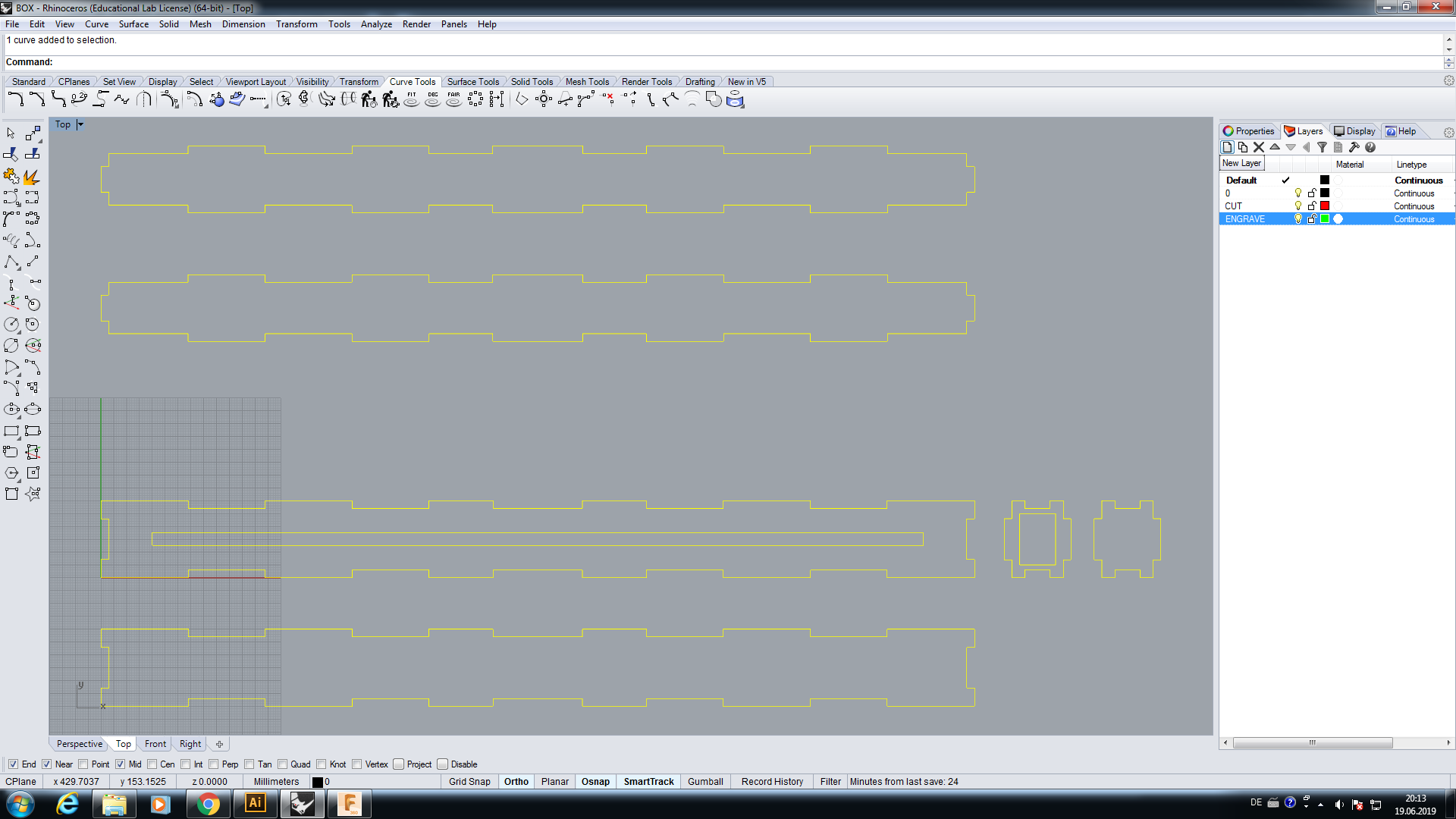 Rhinoceros is a commercial 3D computer graphics and computer-aided design application software or Windows, Apple and Linux. It also has a toolbar on the left and a command line on the top such as LibreCAD. We often use Rhino in the FabLab to generate the GCODE for the laser cutter or CNC machine because you can create different types of layers.