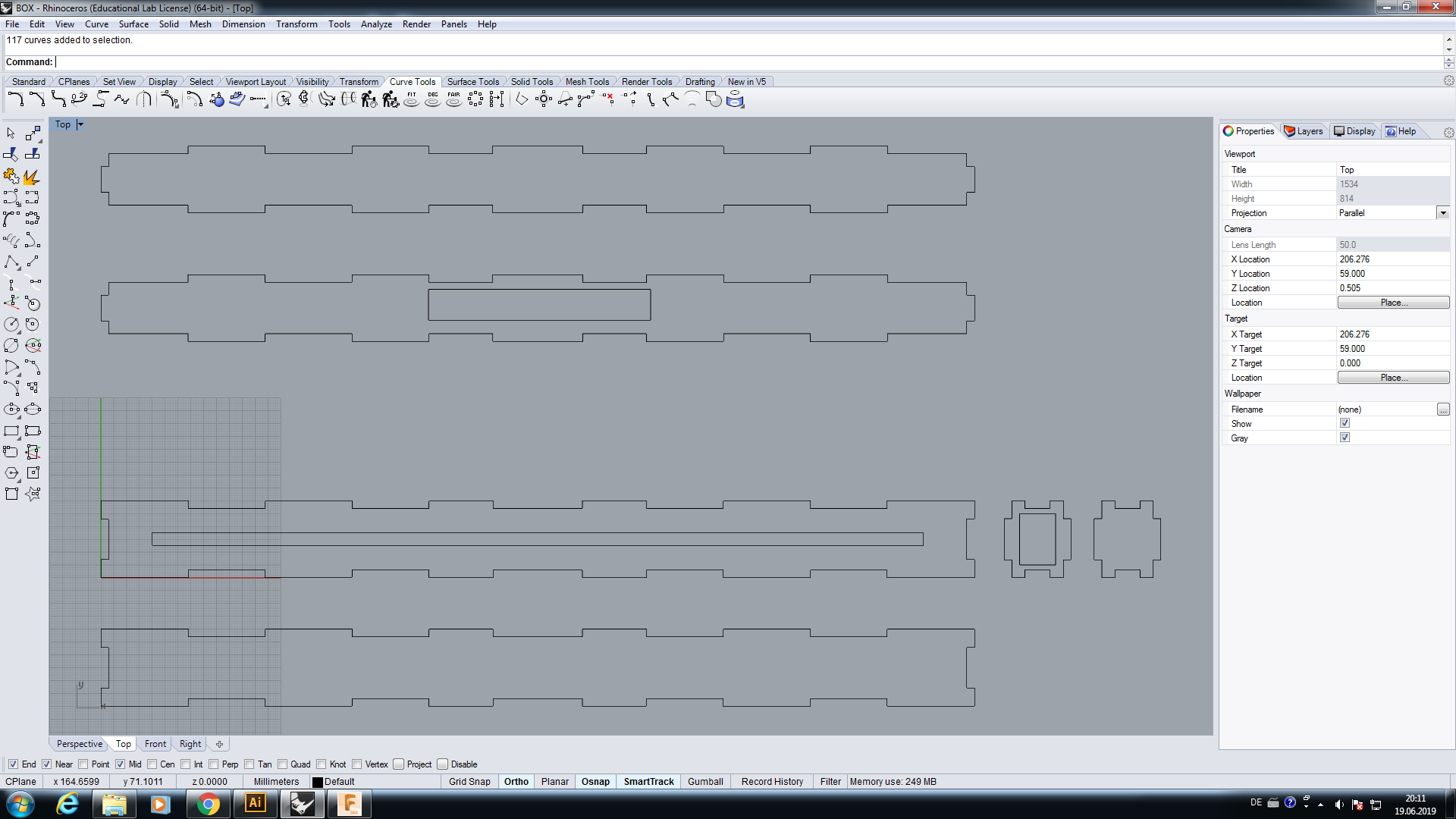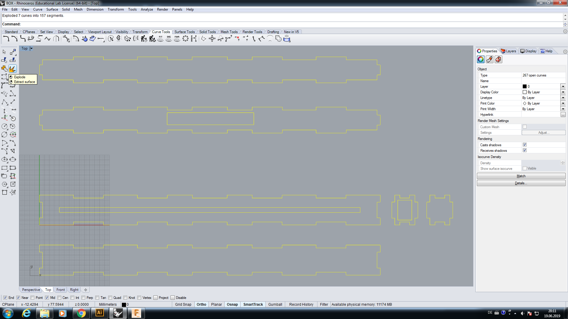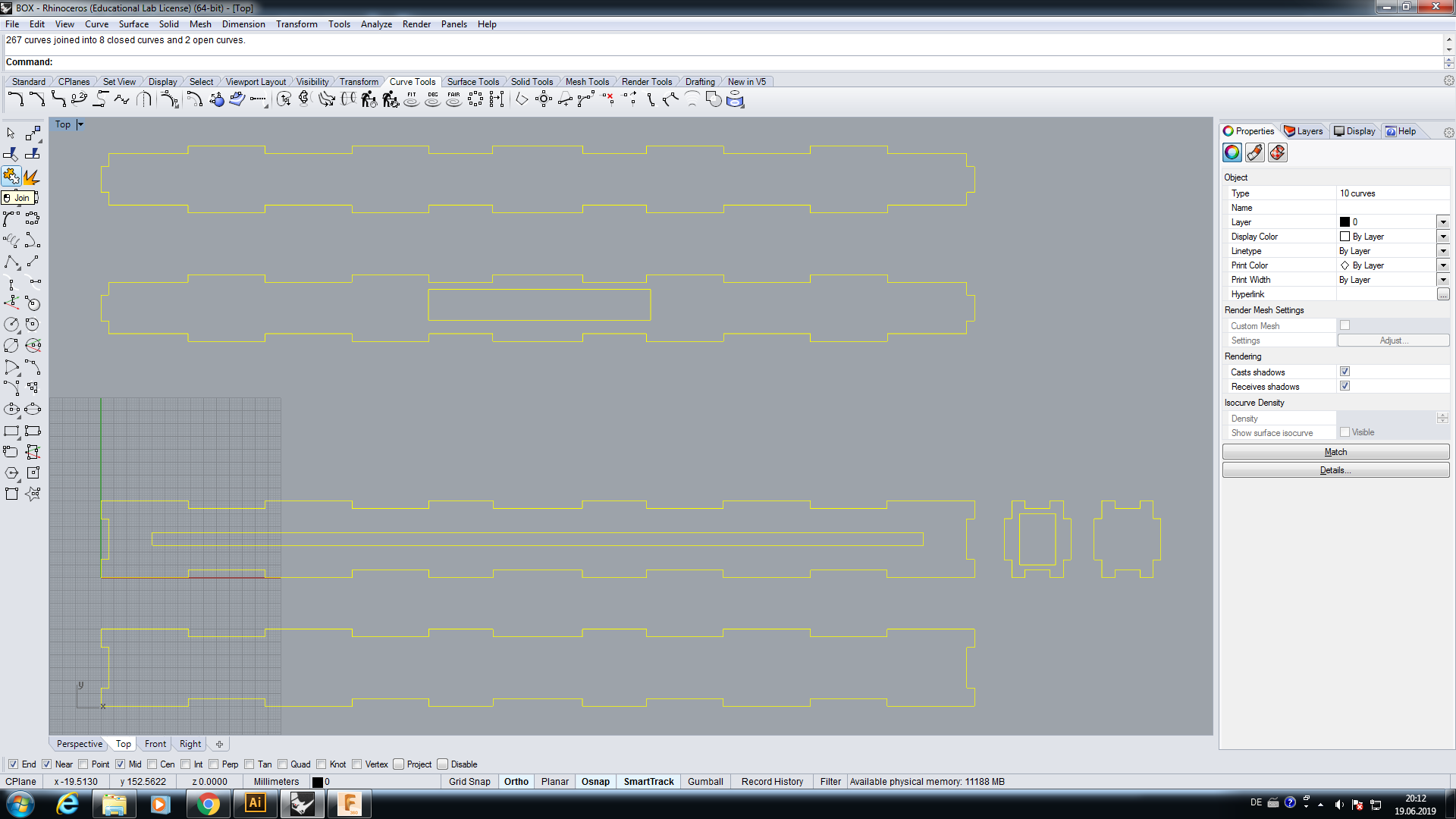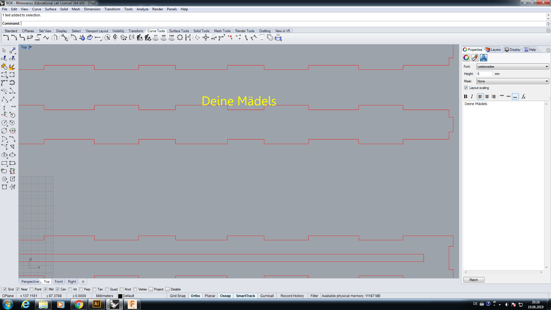 Rhinoceros is a commercial 3D computer graphics and computer-aided design application software or Windows, Apple and Linux. It also has a toolbar on the left and a command line on the top such as LibreCAD. We often use Rhino in the FabLab to generate the GCODE for the laser cutter or CNC machine because you can create different types of layers.