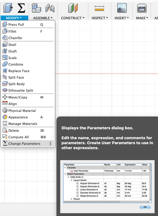 Next you can start creating some parameters. Go to Modify --> Change Paramters.