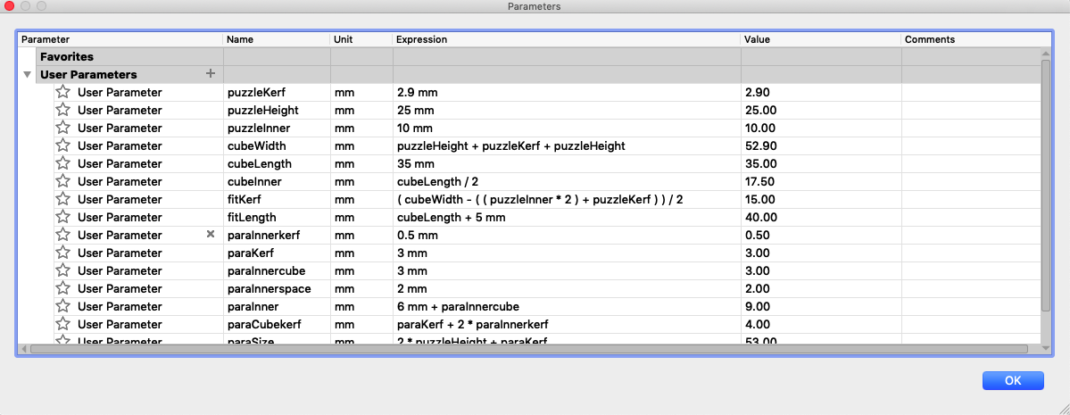 The press-fit below was the first one I designed. I used 3mm plywood to find out if the joint is stable enough. Before starting the job I had to consider the kerf. The kerf is defined by the amount of the material that is removed in a cutting process. This depends on the material type and other conditional factors. Since the kerf for 3mm plywood is 0.1mm, the slots of my parametric design had to be 2.9mm large. Otherwise the joint would be way to large to fit properly.