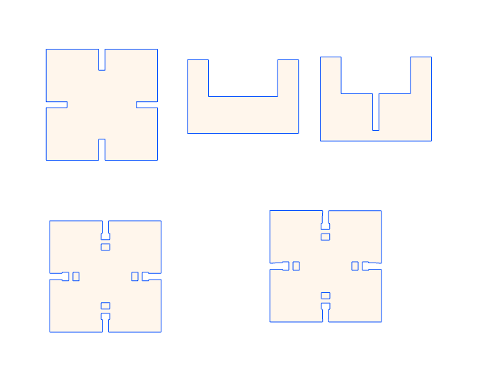 I also liked to experiment with different kind of joints. So first I created a very simple press-fit joint which you can find on the left side of the picture below. Then I wanted to create a jonit that consists of a grabbing function, which you can see at the bottom of the image. After you finished with your design you save the DXF-Files and go to the Laser Cutter.