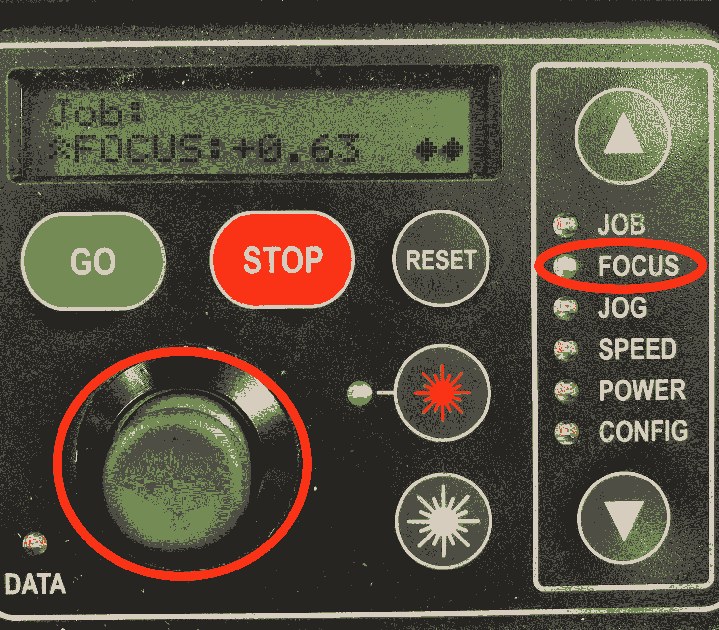 Now select the focus on the menu panel. Use the joystick to move the bed up and down. In addition use the triangle to measure the distance from the laser to the bed.