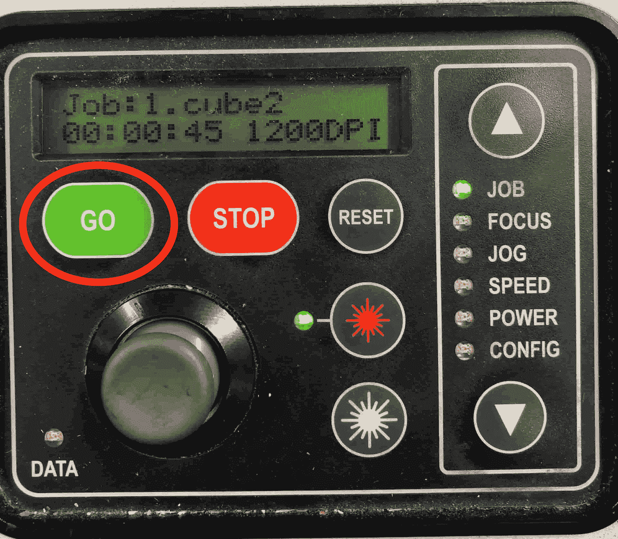 Since everything is set you can start the job. If you think you might have forgotten to confirm something, just push the reset button to check if everything will stay in the right position. On the display you can also see the duration and the file name of the job. Finally start the job.