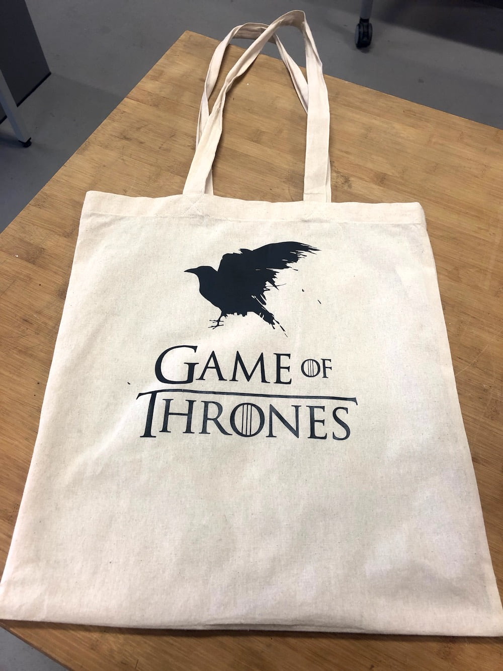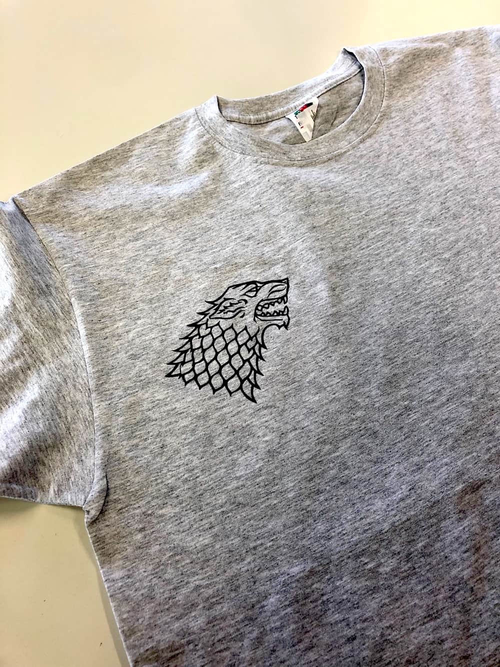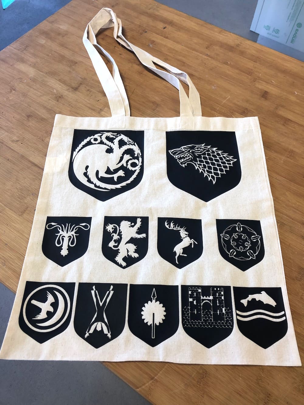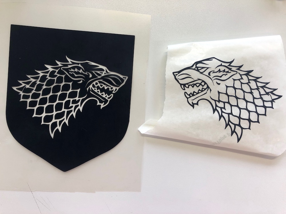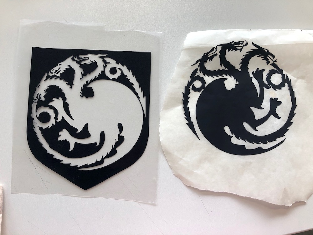 For the Game of Thrones bag I just repeated the steps. Below you have some pictures of the process. I thought it would be such a waste to peel of the dragon and the wolf and throw them away. So I tried my best to don't expend the vinyl while removing it. And so I managed to remove the inside of both houses carfully without destroying them and paste them on a piece of transferring paper. Now I can use both designs.