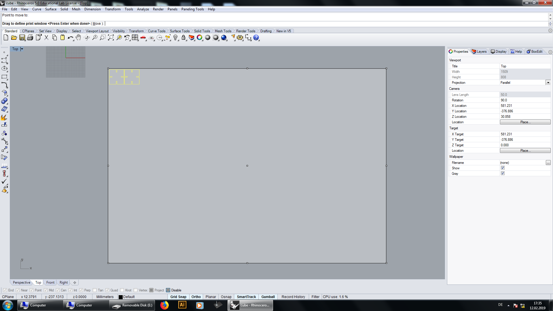 The start point of the laser cutter is in the left upper corner, so we have to set the window as near as possible to the design to don't waste a lot of material. Press enter and confirm the position of the window.