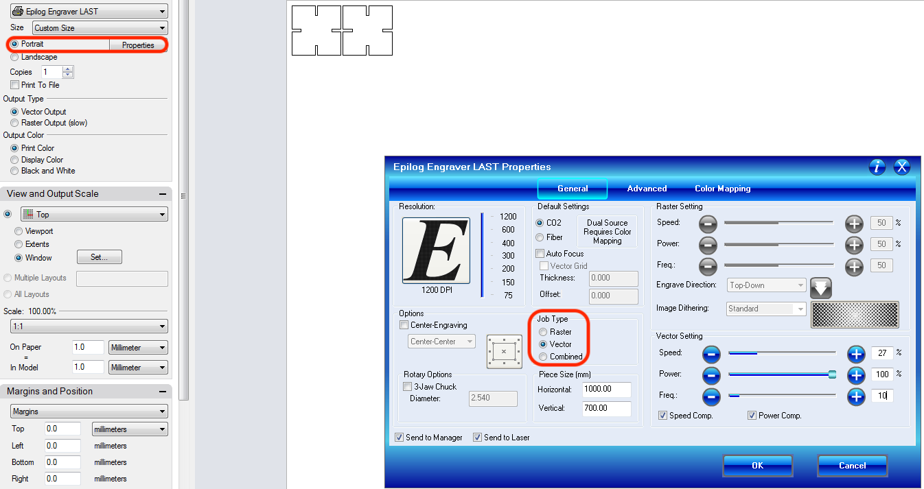 Finally you can set the properties for the laser. Since we want to cut out the pieces we select vector as job type. Now just set the vector settings (power, speed and frequency) and send the job.