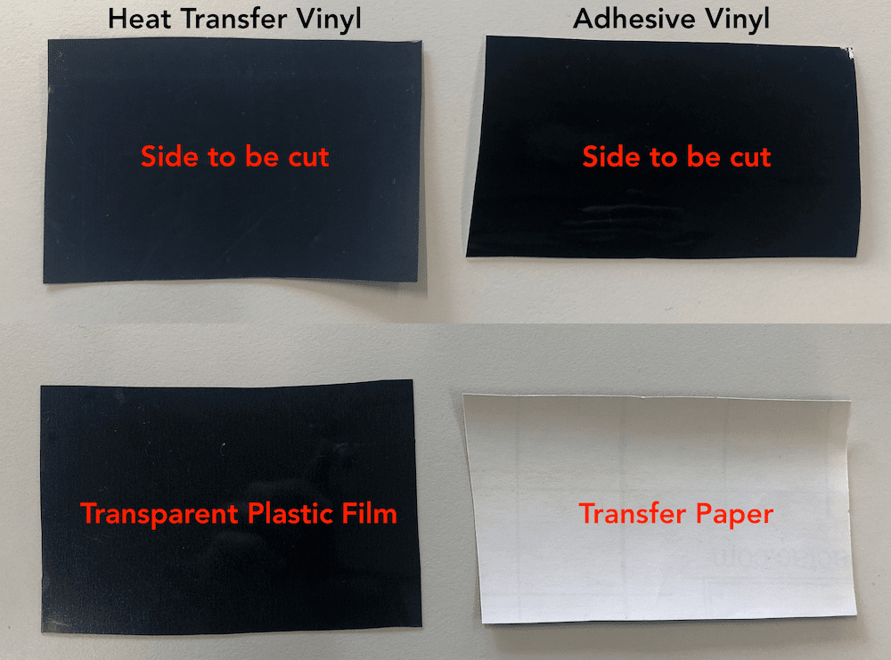 There are two basic types of vinyl: Adhesive Vinyl and Heat Transfer Vinyl. Adhesive Vinyl is a thin flexible material with an adhesive on the backside, which allows you to paste it on all kinds of smooth, hard surfaces. Heat Transfer Vinyl (T-shirt Vinyl) is a similar material only that this kind of vinyl can be paste on fabric surfaces (or any surface that can stand the heat). Because they both look pretty much the same, you can only tell the difference by checking the adhesive. Adhesive Vinyl always has transfer paper underneath and when you peel it of it is very sticky. Heat Transfer Vinyl, on the other hand, does not have a transfer paper. Instead it has a transparent plastic film that covers the top of the vinyl. The other side is where the adhesive is and it's not sticky. You always cut on the adhesive side (usually it's the one that's not shiny).