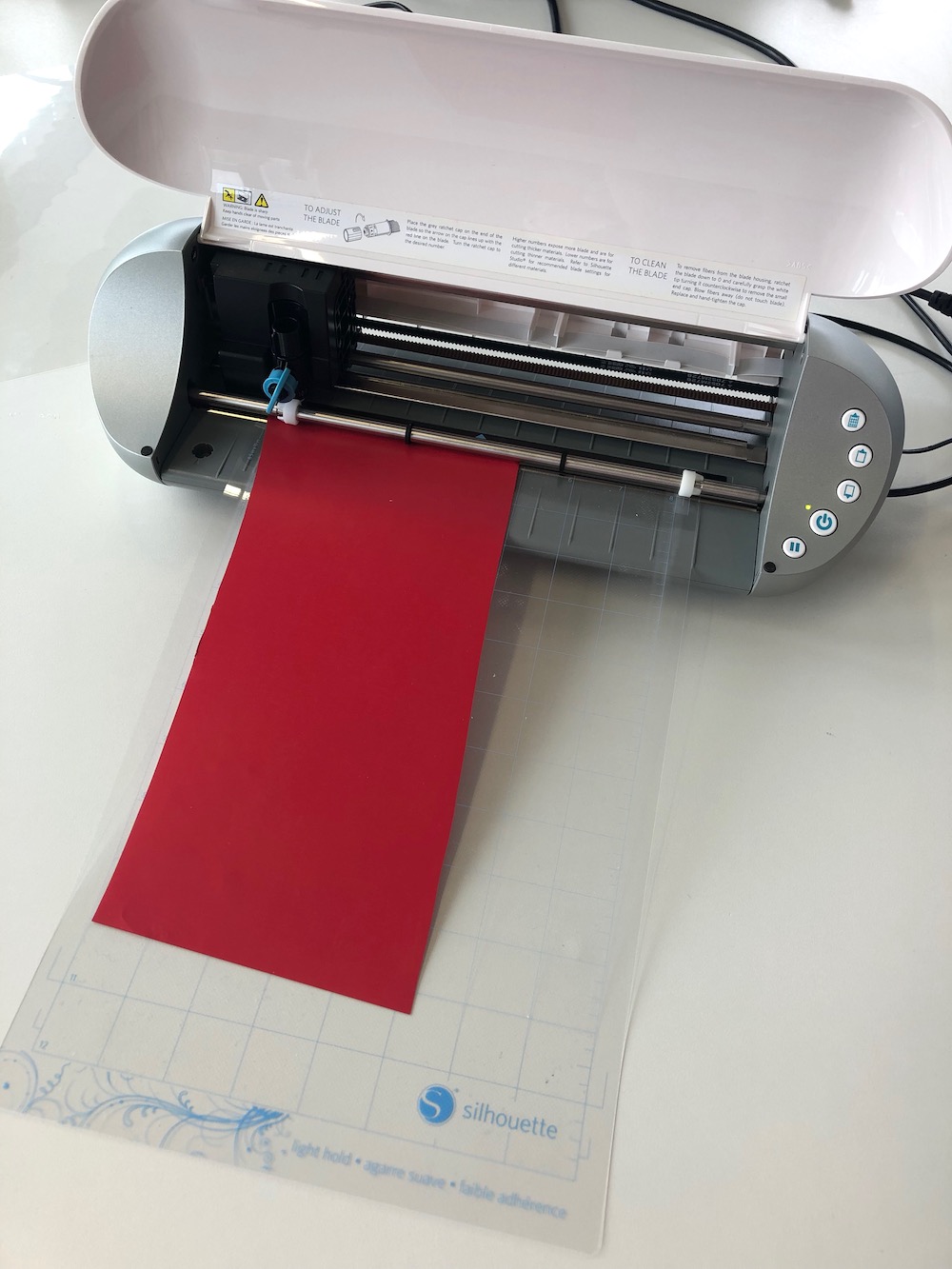 Before you start you need to set the height of the blade. I recommend you to always make a test cut with a piece of vinyl, to be sure of how deep the blade needs to be. The goal is to cut everything out by leaving the plastic film of the vinyl untouched. Remove the knife tool and use the knob to decrease or increase the quatity of the blade.