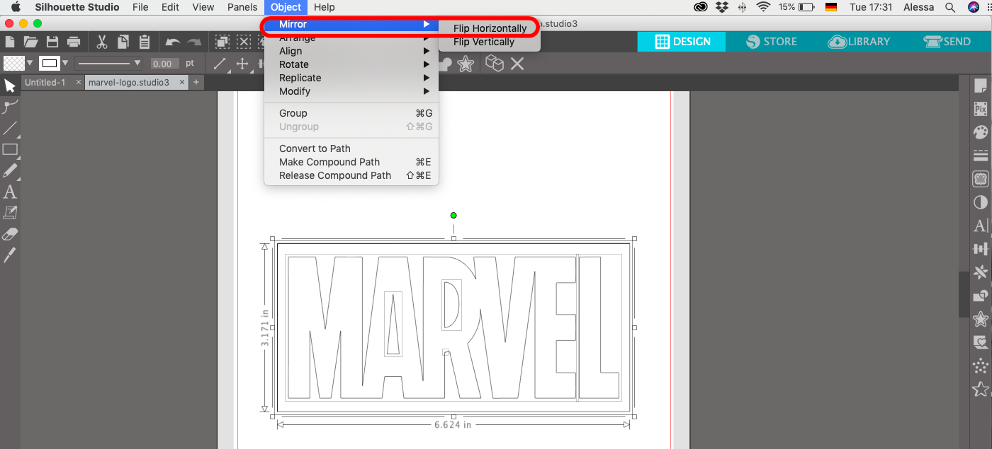 Because we are cutting on the backside (adhesive side) of the vinyl we need to mirror the word. To do this go to Object --> Mirror --> Flip Horizontally.