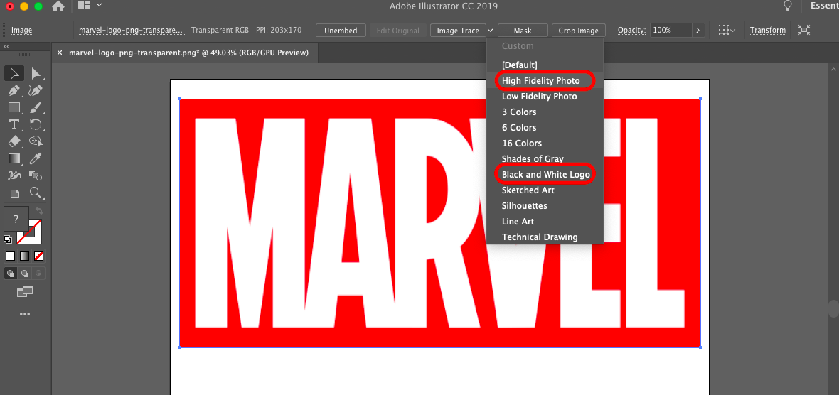 Then go to the control panel and select the arrow next to Image Trace. Here you can select either black and white logo or high fidelity photo. When you just want to vectorize a logo or a text choose the black and white logo.