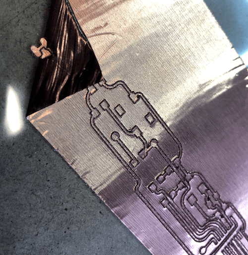 The idea was to stick the copper sheet on a flexible plastic film and then mill the tarces on the copper with the Roland. So for this particular job I used a cut depth of 0.0mm, to prevent the bit from cutting too deep into the copper sheet and cut through the plastic film. To get a very accurate result I used a 0.1mm tool. The offset is set to 1, since the aim is to only expose the traces and remove all the unnecessary copper from the plastic film.