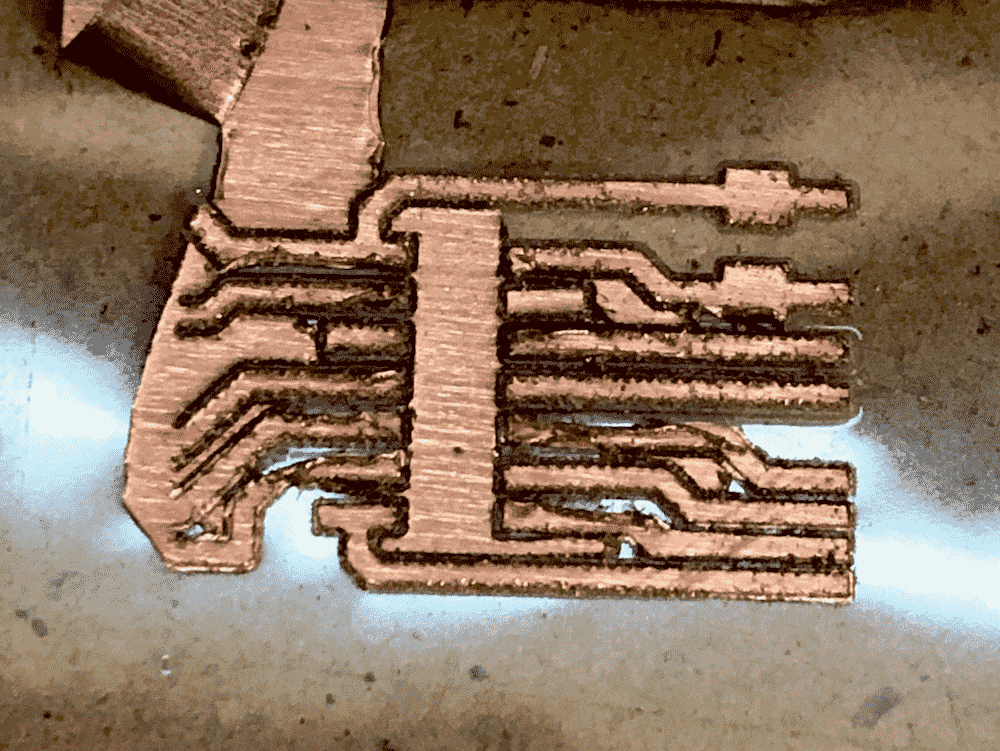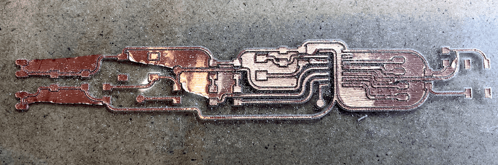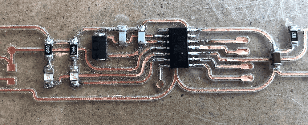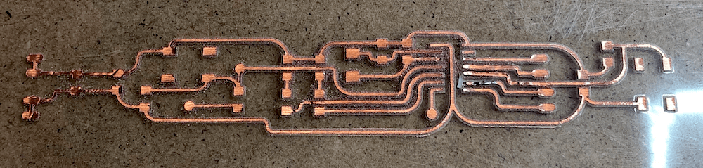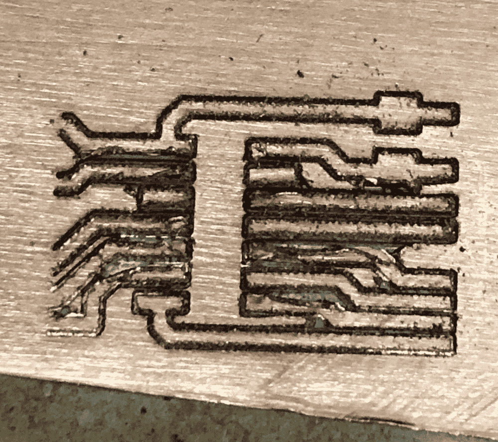 Since everything went as planed, I tried the mill the traces of the microcontroller. Underneath yoe have the result of the process. Here I recognized that the bit went a little to deep and I had also to reduce the speed, so that the bit won't tear the traces.