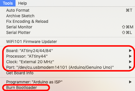 Then go to Tools and set the correct configurations of the board. Since I included an external 20 MHz cristal, you need to select it as clock, otherwise it will use the internal clock of the Attiny 44. As soon as everything is set burn the bootloader.