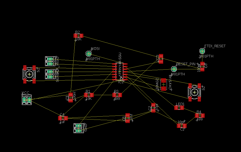 • 4 x M02 pin header. Two of them represent the multiple GND and VCC: used to provide power to the board. One for the MISO and SCK pins, since I had to split the ISP pins. And the last one for the TX, RX serial communication pins.
