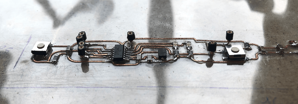 As I finished I recognized that the width of the routing was way to thin. Thin traces break very quickly, be it because of the heat during soldering or while milling the board. So it was matter of concern to change that.