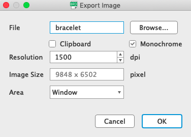Furthermore the resolution has to be 1500 dpi, the area window and you also need to check the monochrome box. Then name the file and export it as PNG.