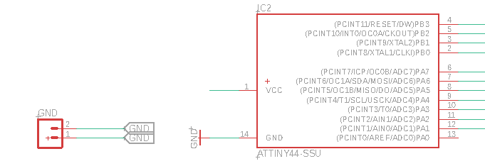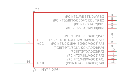 In the window that appears you can search for the components you need for your design. Below I added the ATtiny44. When you find the electronic component just confirm your selection and place it wherevery you like. Since I was adding the core of the board, I placed it in the middle.