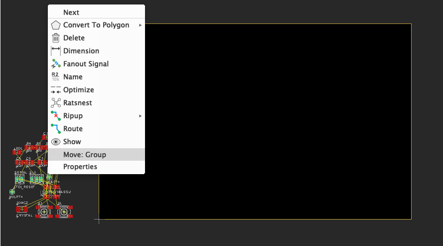 In the board layout window your design will be placed outside the canvas. To move the design you first need to select the entire design by clicking on the group element in the toolbar.