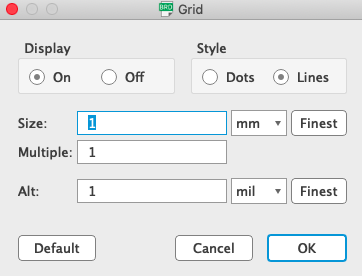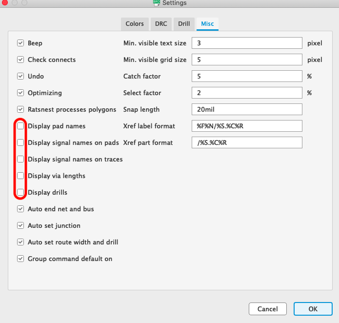 Then go to setting and deselect all the boxes below. If you are going to mill a board you usually display also the drills. But since I am using a copper sheet to mill the traces, I don't want to drill the holes for the through hole components. The copper sheet is about 0.2mm thick and not strong enough for such a construction.