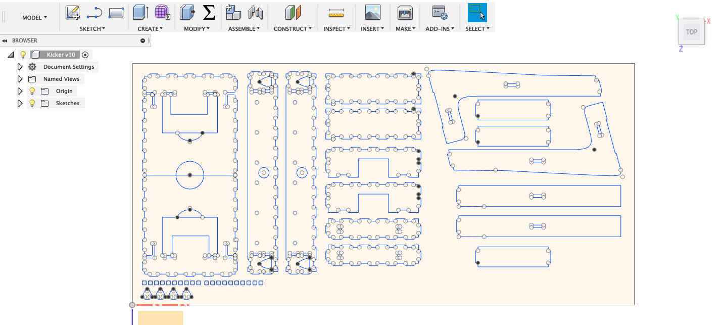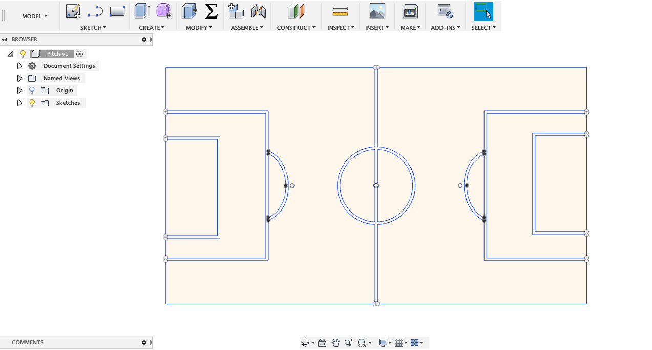 To create my design I used Autodesk Fusion 360. At first I hat to come up with a cool idea for this assignment, so I searched the internet for inspiration. After a while I decided to design a foosball table. To get a rough idea of how all the parts are composed, I started drawing a sketch. Since the size of the wood panel was 250x120cm, I had to modify the original size of the foosball table. The original length of the soccer field is 120x68cm. I scaled everything except of the table legs with a factor of 0.66667 so that my soccer field is 80x45. I did this, because if I would have used the original sizes, I wouldn't have enough space to mill the table leg's. I did a couple of calculations, since I had to design 9 pieces (excluding the leg's).
