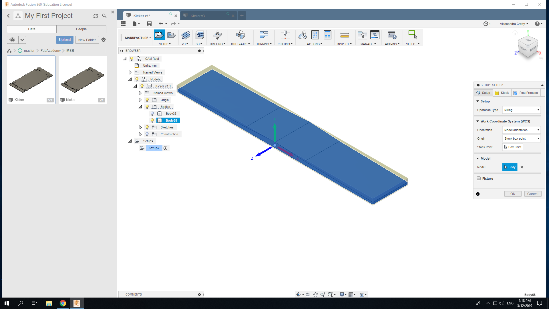 Here a new setup needs to be created. Important is to indicate the correct axes that match the block positioned inside the CNC machine as well as the origin point of the tool. In this case, it is the top-left corner.