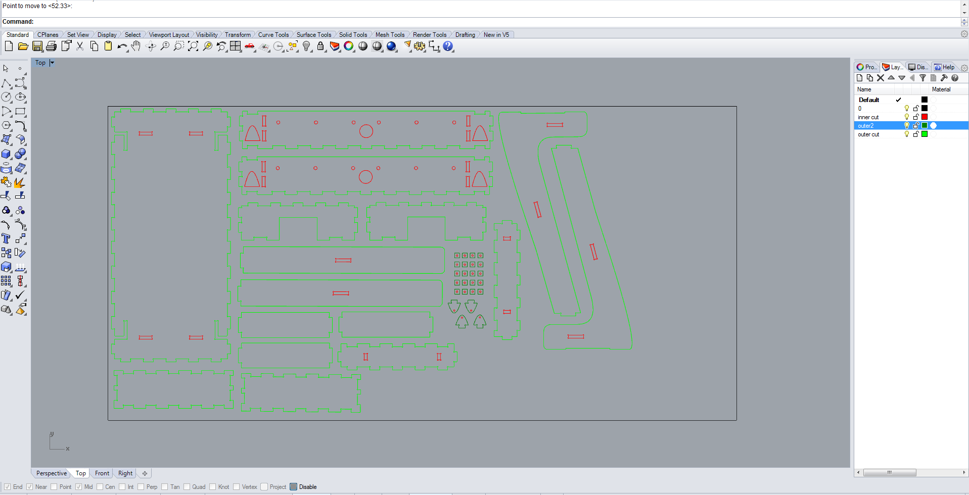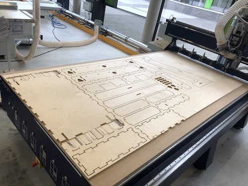 In case of my job, the tool size for all the jobs is 4mm, so I only distinguished between inside and outside cuts. Moreover I had two outer cuts, one for the large parts and one the small parts. Because with the smaller parts I had to make sure that these parts didn't fly out. The rule of thumb is to go from the inside to the outside in order to achieve the best result. The file with the different layers is then saved and imported into the software of the machine.