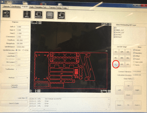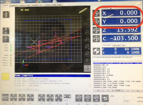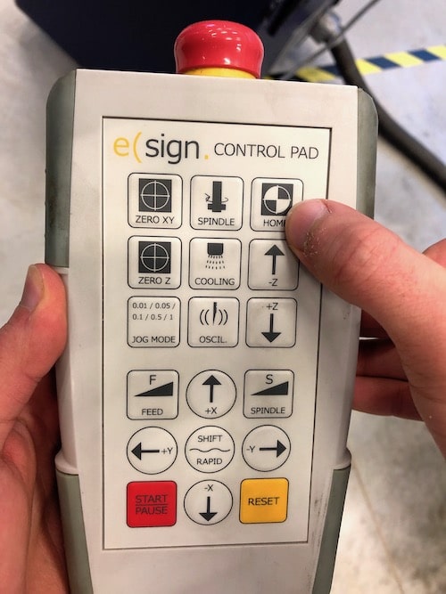 Next you will have to set the zero point, which is the starting point of your job. To do this I used the remote control. By pressing the shift button and one of the axes you can move at high speed. In our case, the origin point is always the lower left corner. To check if you have set the X and Y coordinates, go to the software and make sure it displays zero.