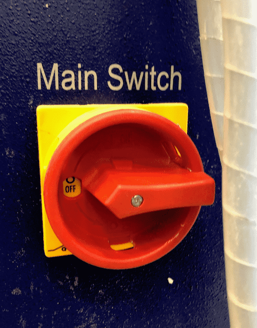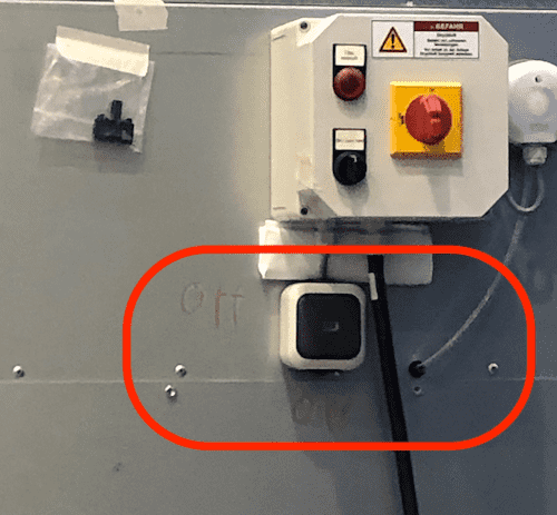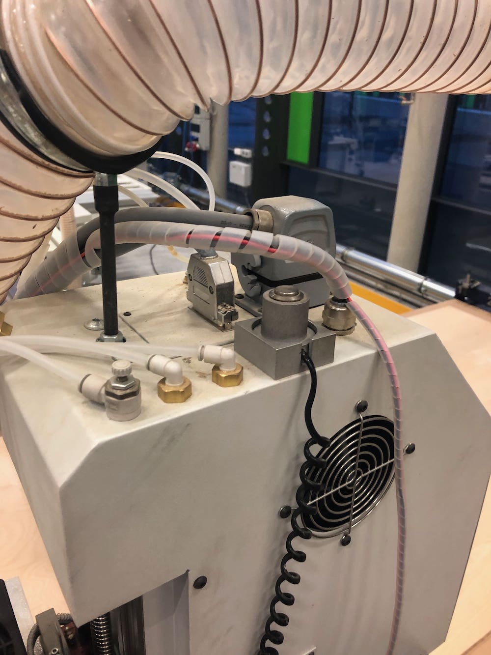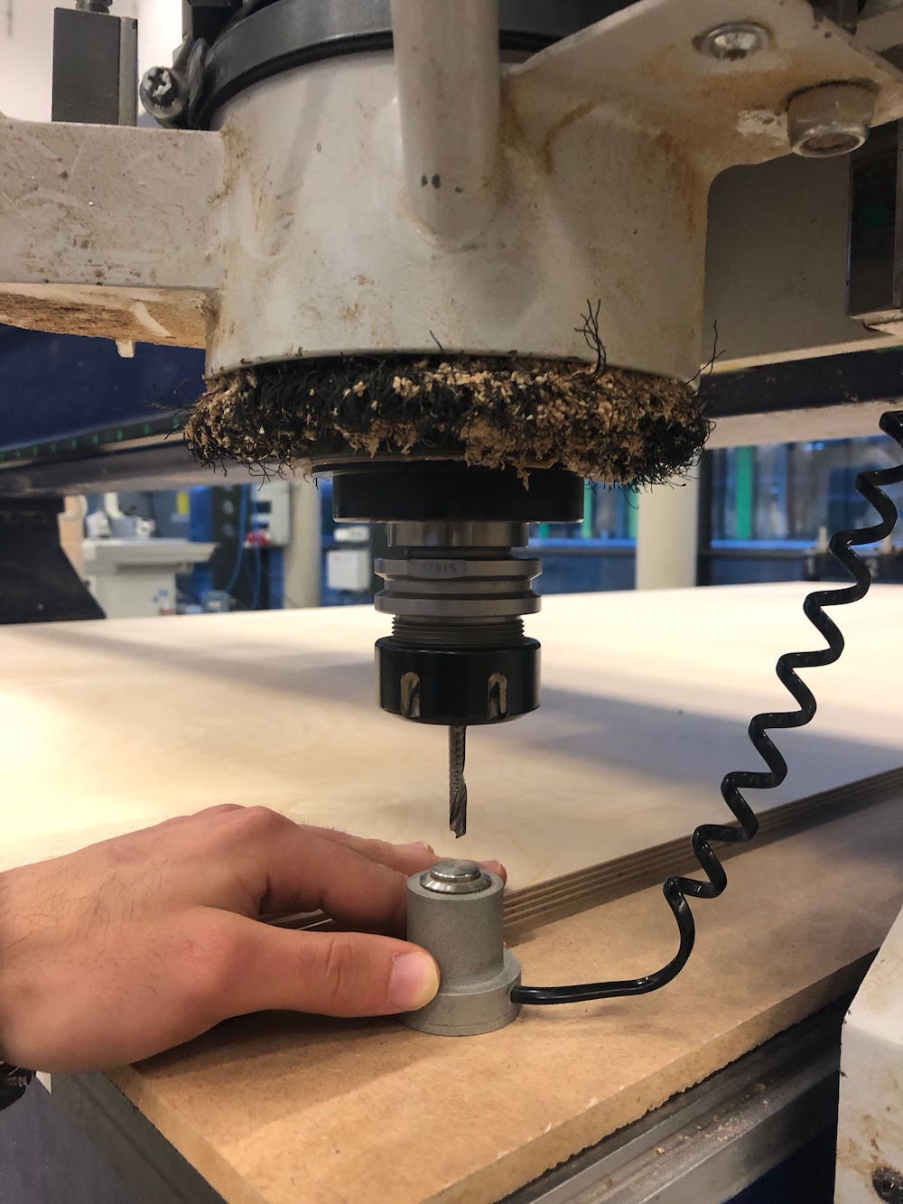 To adjust the Z-axis, you must use the sensor that measures the exact height of the bed. You can find the sensor on the head of the machine. To set the Z point we need a second person that holds the sensor. Always check if the person is ready, since the machine is going to move.