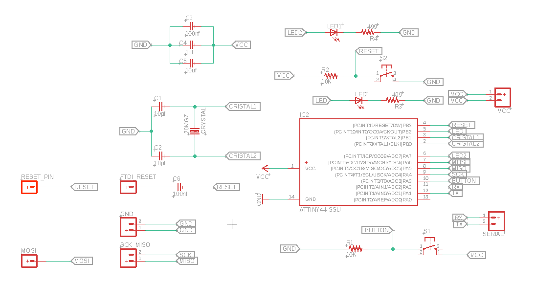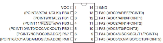 I used the ATtiny44 MCU as microcontroller. Below you can see it's pinout.
