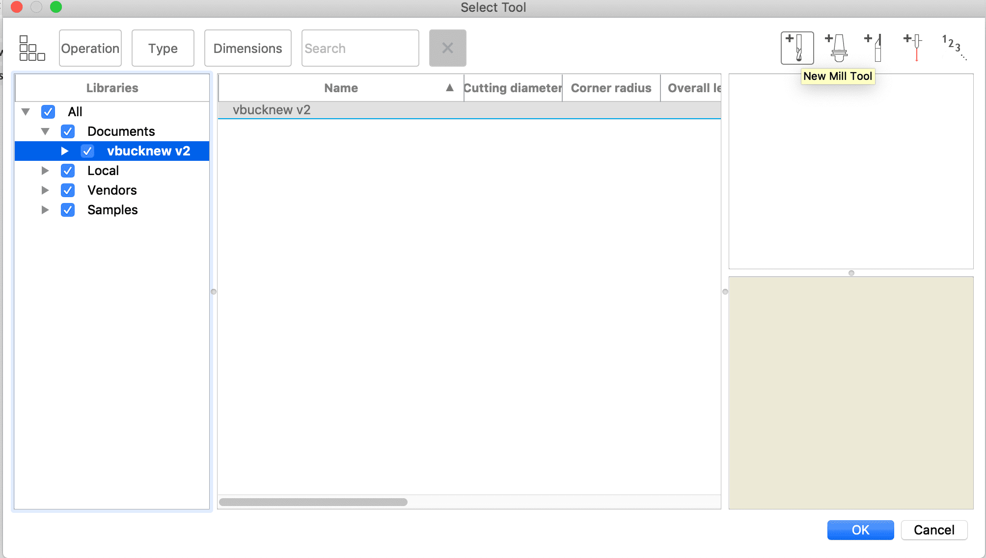 A window opens, in this window I am now able to select a tool. In my case I haven't got a tool yet so I had to add a tool by pressing on the new milling tool button on the right side
