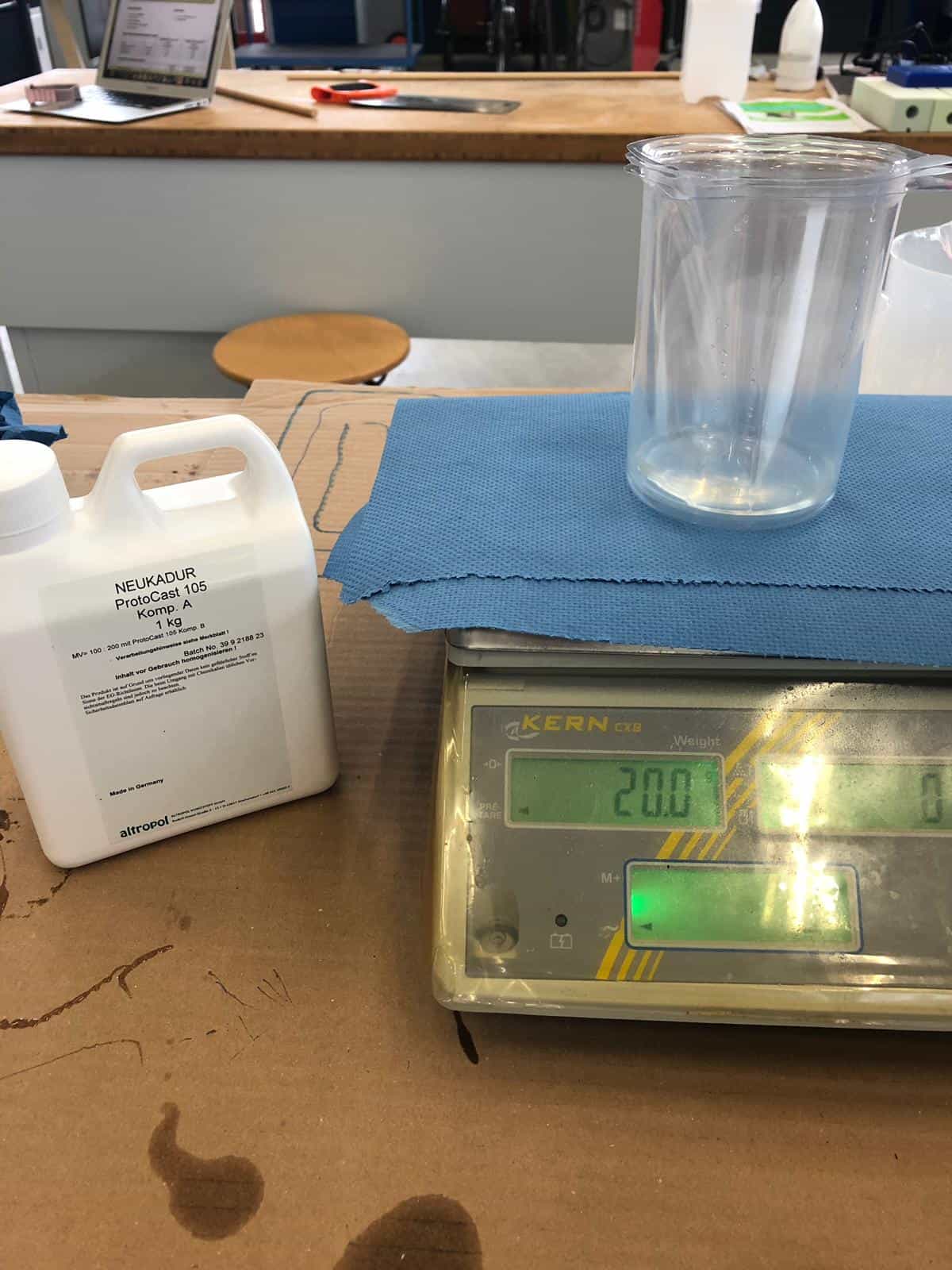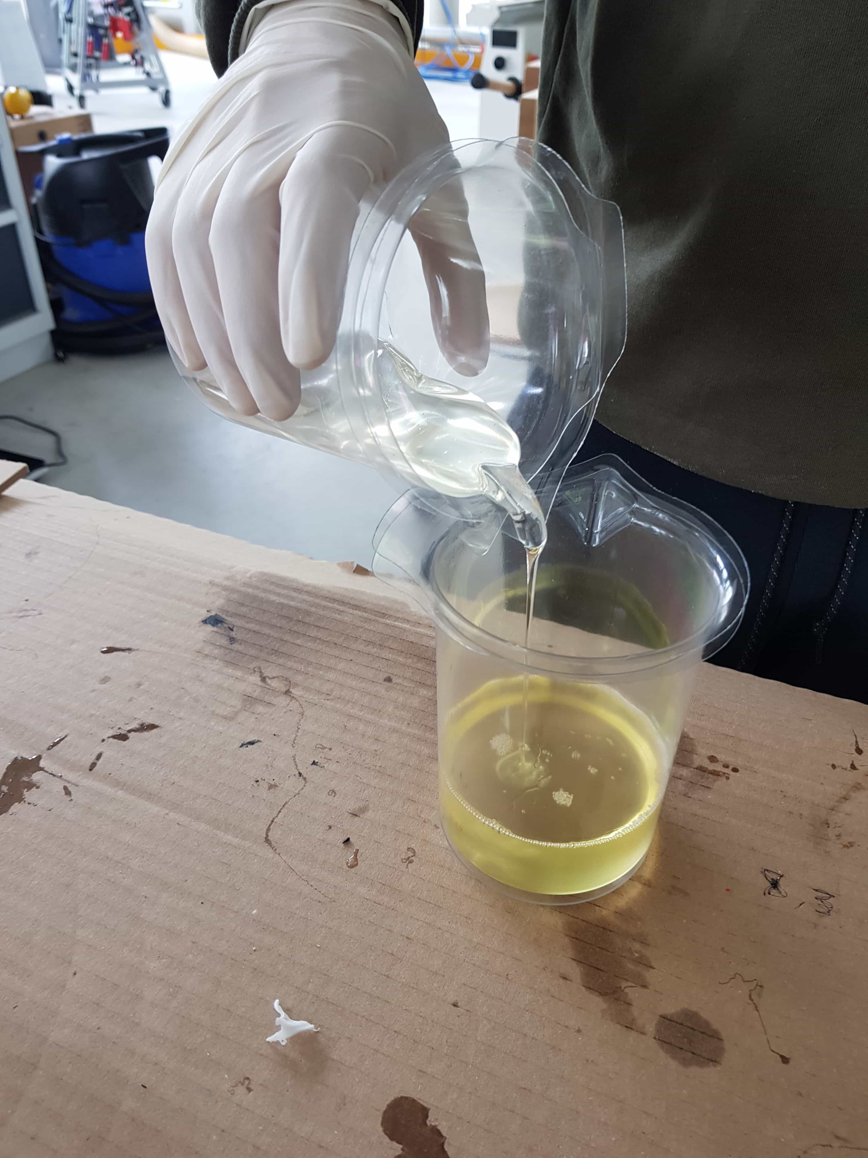 according to the datasheet the mixing rate of the resin is 70:100, so for example on 100 grams of comp b I have to take 70 grams of component a. I mixed them together carefully..