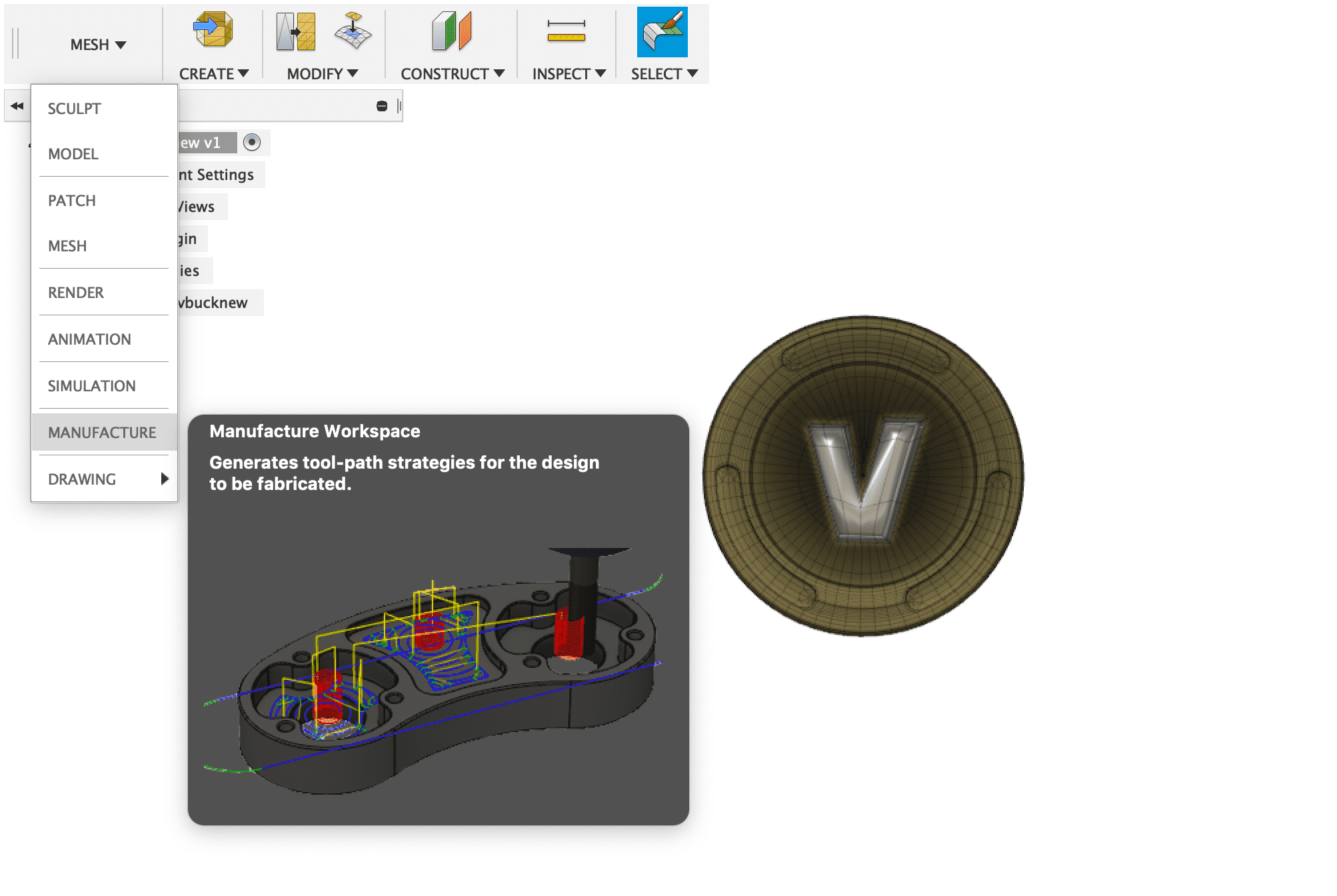 I will use milling as the operation type, I just navigate to Manufacture in the top left