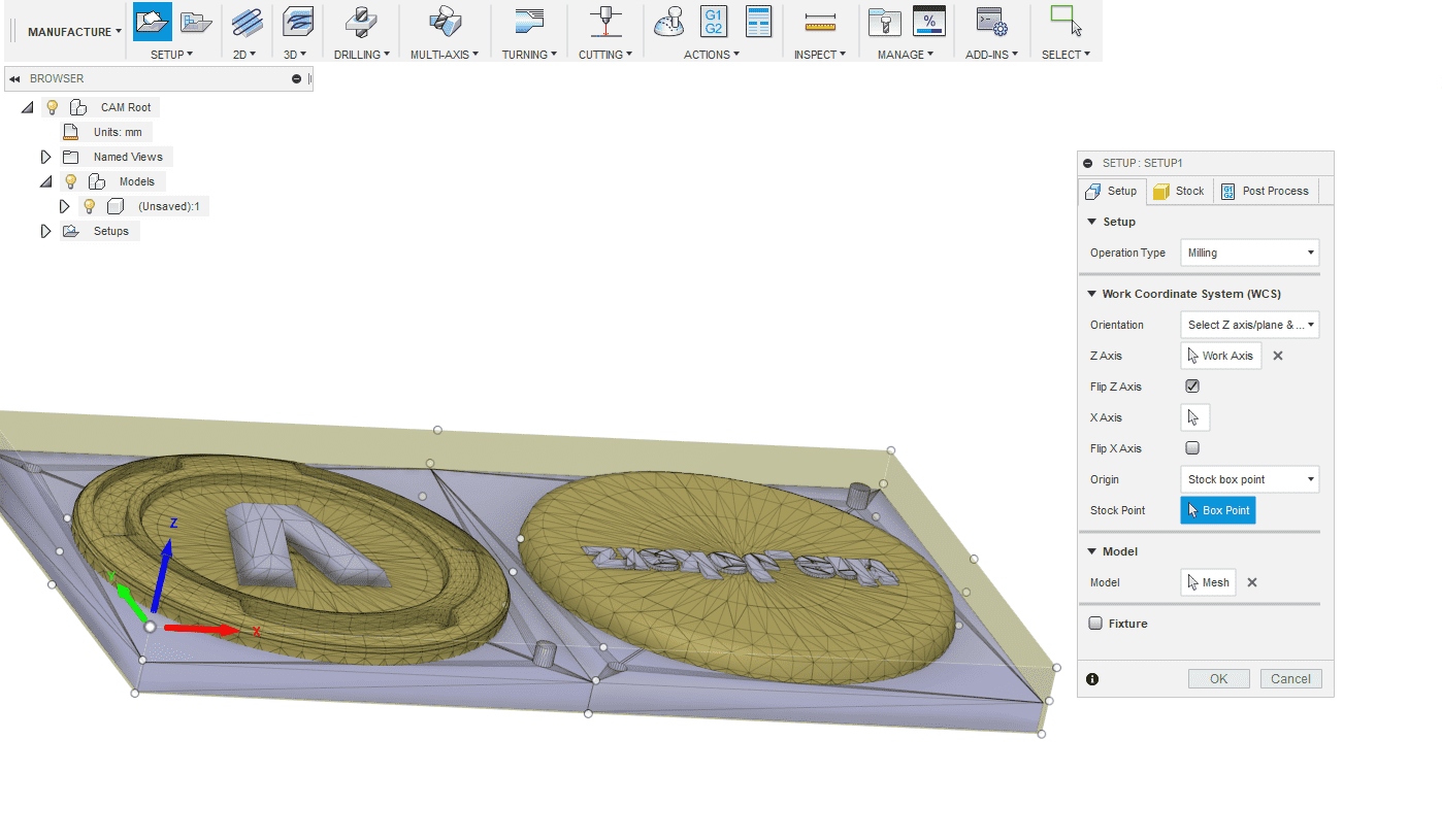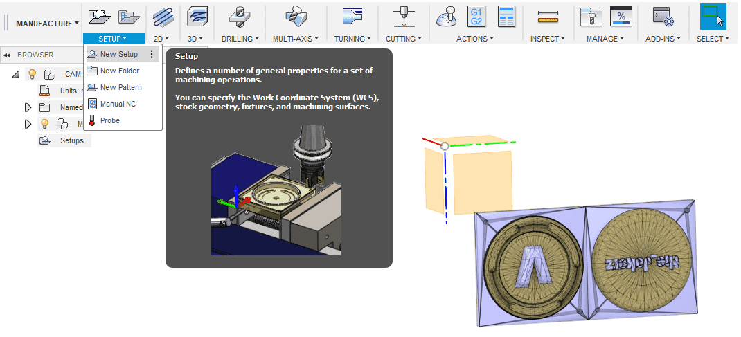Then I create a new setup by selecting Setup -> New Setup. In the new setup we have to set an orientation axis according to the model this could change. The second thing to set is the stock point according to the zero point of our CNC-machine.