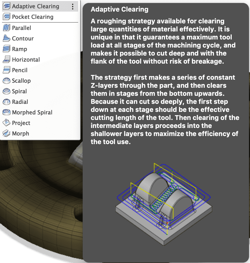 The first technique is Adaptive clearing, which is used to get rid of most of the material, the technique guarantees a maximum tool load the whole process.