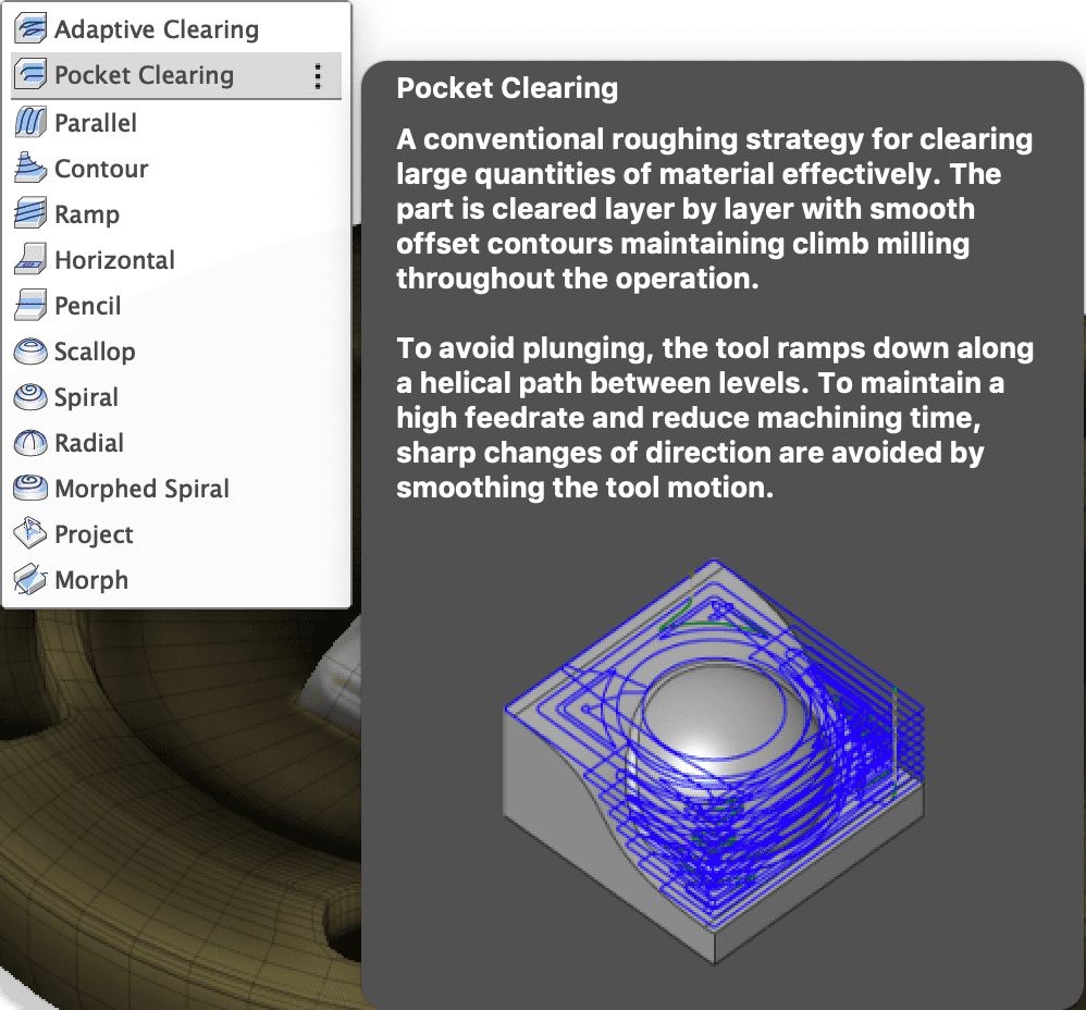 Another technique is Pocket clearing, which is also used to get rid of most of the material. The difference to adaptive clearing is that it takes of the material layer by layer and does not calculate a specific toolpath, which can save time and guarantees maximum spindle speed at any time of the process.