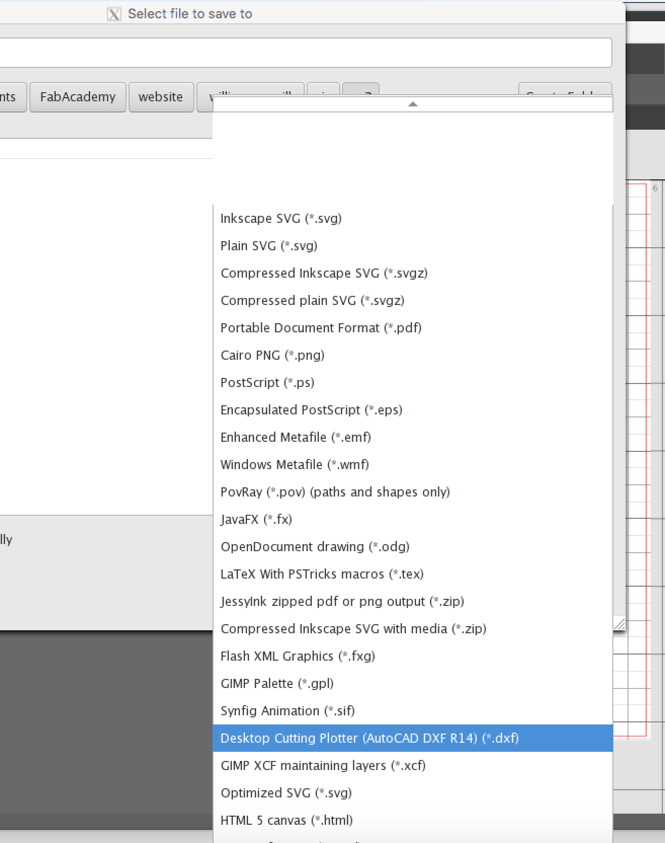 Then it had to be vectorised. The new png file was imported into Inkscape. Since it was already a monochrome image, it could be simply saved as a DXF file using the setting below, ready for the cutter software.