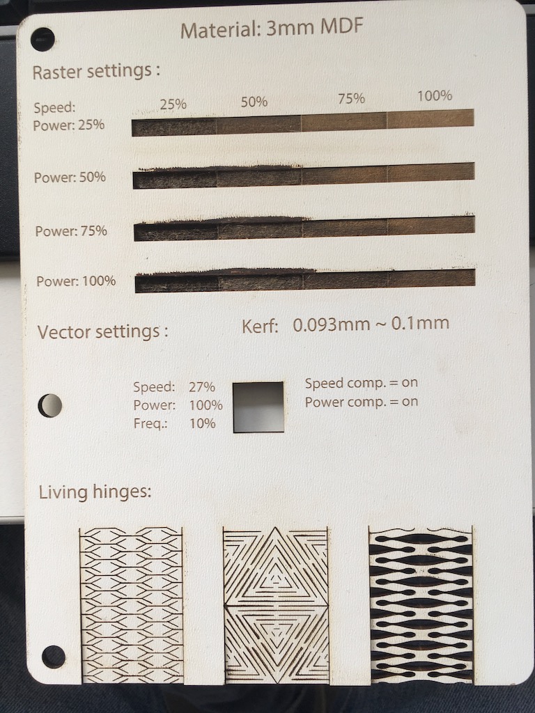 The team this year did a fabulous job of exploring the laser cutter’s capabilities, and summarised it on a bit of MDF.