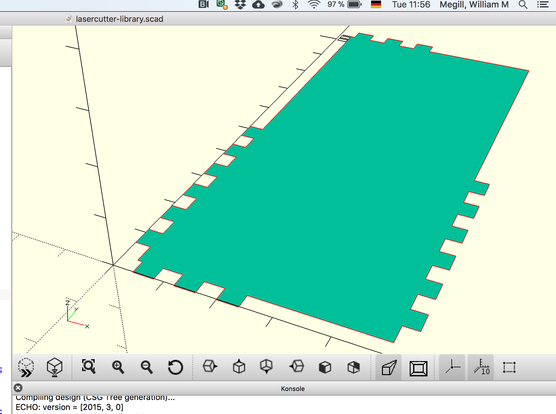 To cut the parts on the laser cutter, I commented out the “linear extrude” commands from each of the part descriptor modules, then selected one part at a time, with a rotation of [0,0,0] so that it sat flat on the x-y plane, rendered the object, and saved it as a 2D DXF file.