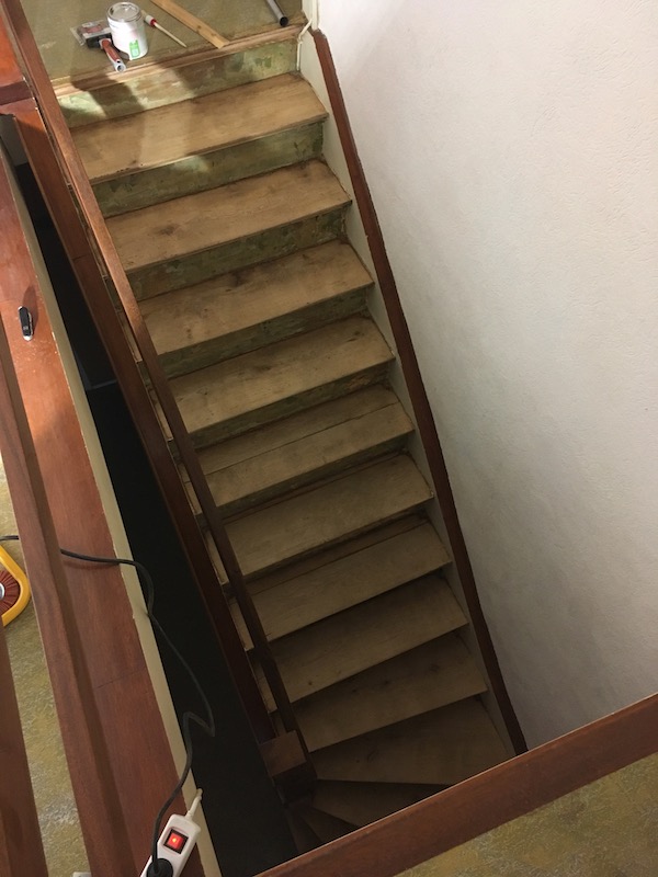My individual laser cutter project this year was to make some risers for the stairs in the house my wife and I are renovating. The stairs were covered in a layer of horrible carpet which had been glued to the wood, which had been painted in the 1950s fashion with a thick coat of red floor paint. The carpet came off ok, but the glue residue and paint removal was a backbreaking and soul-destroying job which involved a lot of sandpaper disks and a rotating wire brush tool for my power drill. Here’s the state of the staircase after the dust had settled.