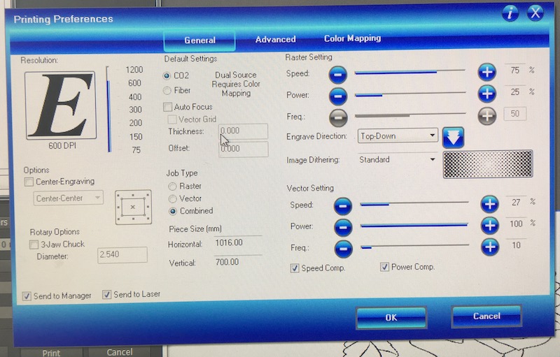 The file was then printed from Rhino. Using the settings described by the team on their MDF info-board, I set the print dialog as follows.