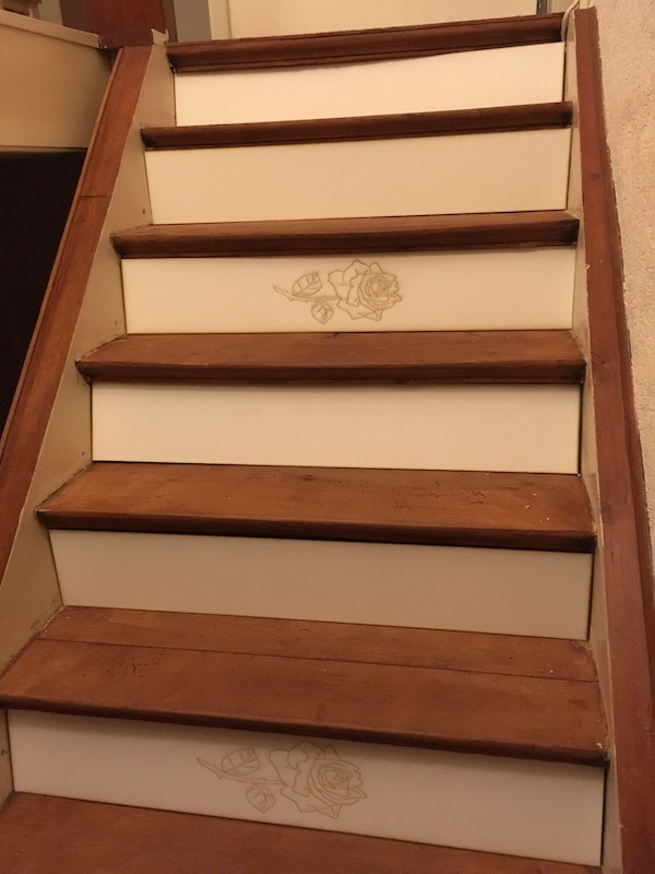Due to measurement imperfections, the cutouts weren’t perfect fits to the spaces on the stair risers, so they didn’t just pop in. I’ll have to cut them down by hand a bit, but here’s a temporary image to show more or less how it will look when it’s done.