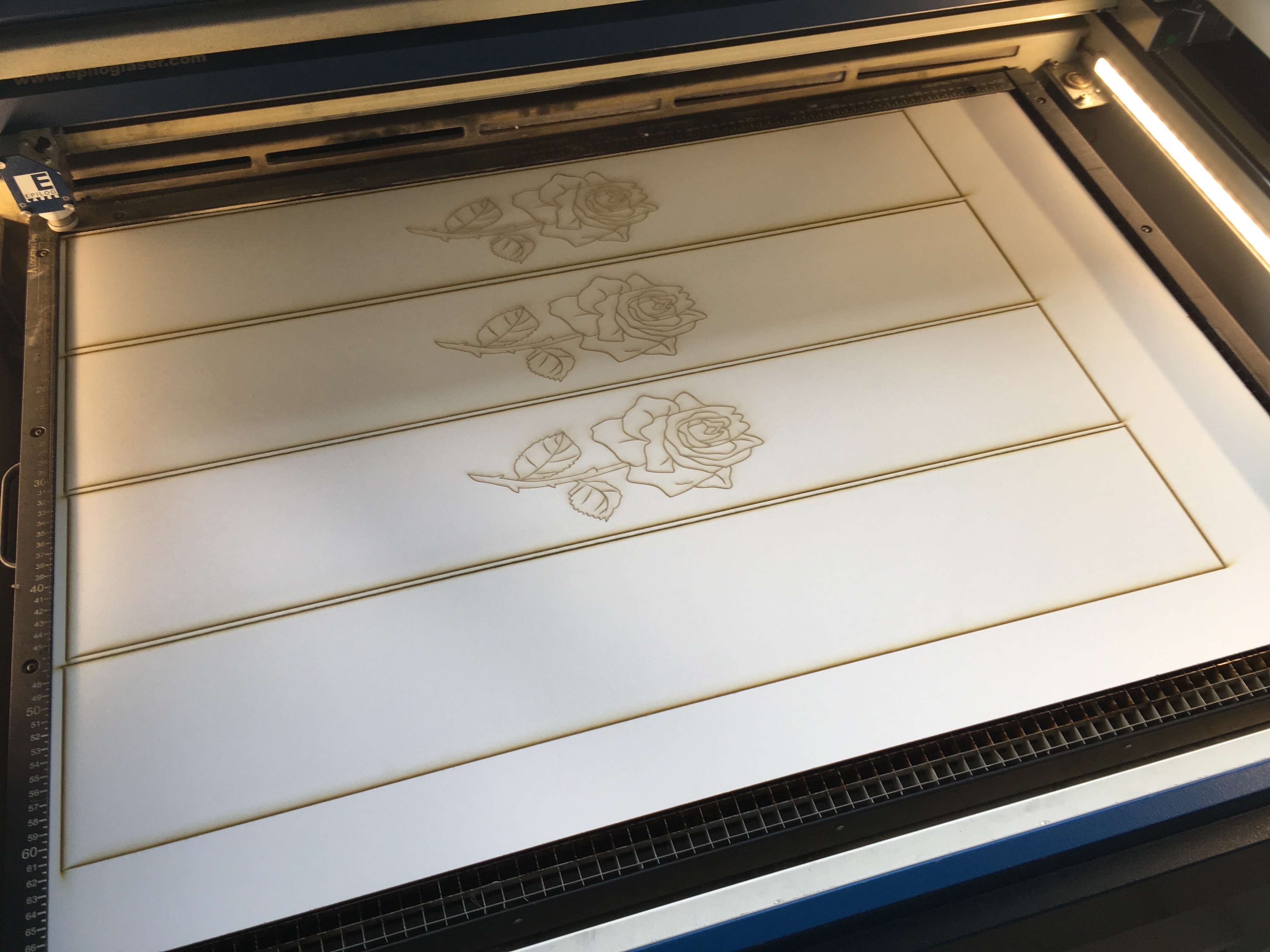 For some reason, the lasercutter didn’t enjoy the “combined” job type, so for the rose-containing pieces, I did the job twice, first to engrave the rose using the raster settings, then second to cut out the riser using the vector settings. Partway through the job, here’s what they looked like coming off the lasercutter.