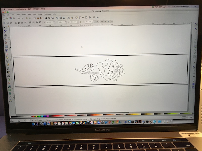 I drew the risers in Inkscape. For the non-rectangular risers, I used the edit nodes tool. To spice up the staircase a bit, I decided to add some artwork to some of the risers. I downloaded a line-art rose from the net, and imported it into Inkscape. Here’s a typical screenshot from Inkscape.
